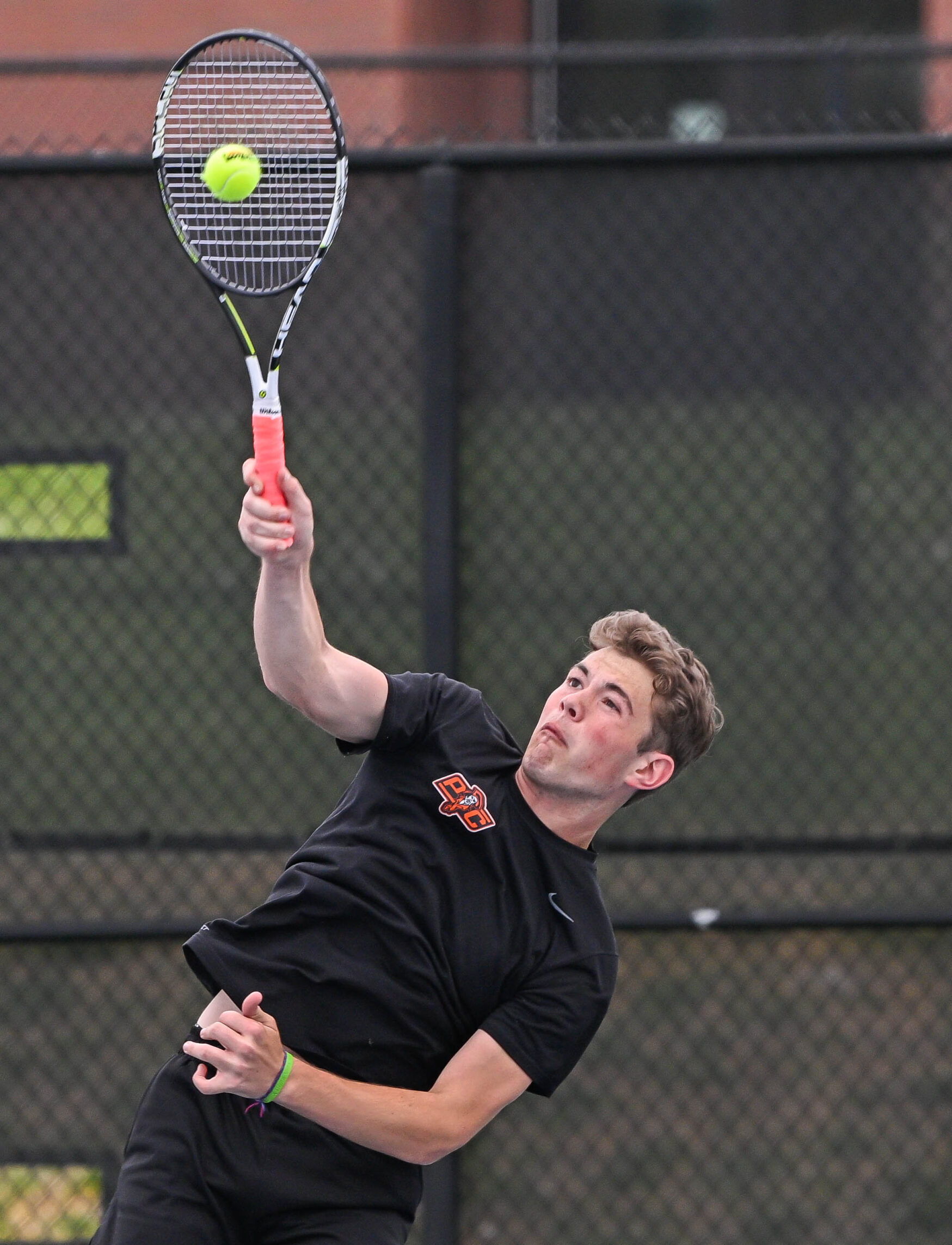 Platte County junior Jack Bralley hits a serve during a dual against Staley on Wednesday at Platte County High School.