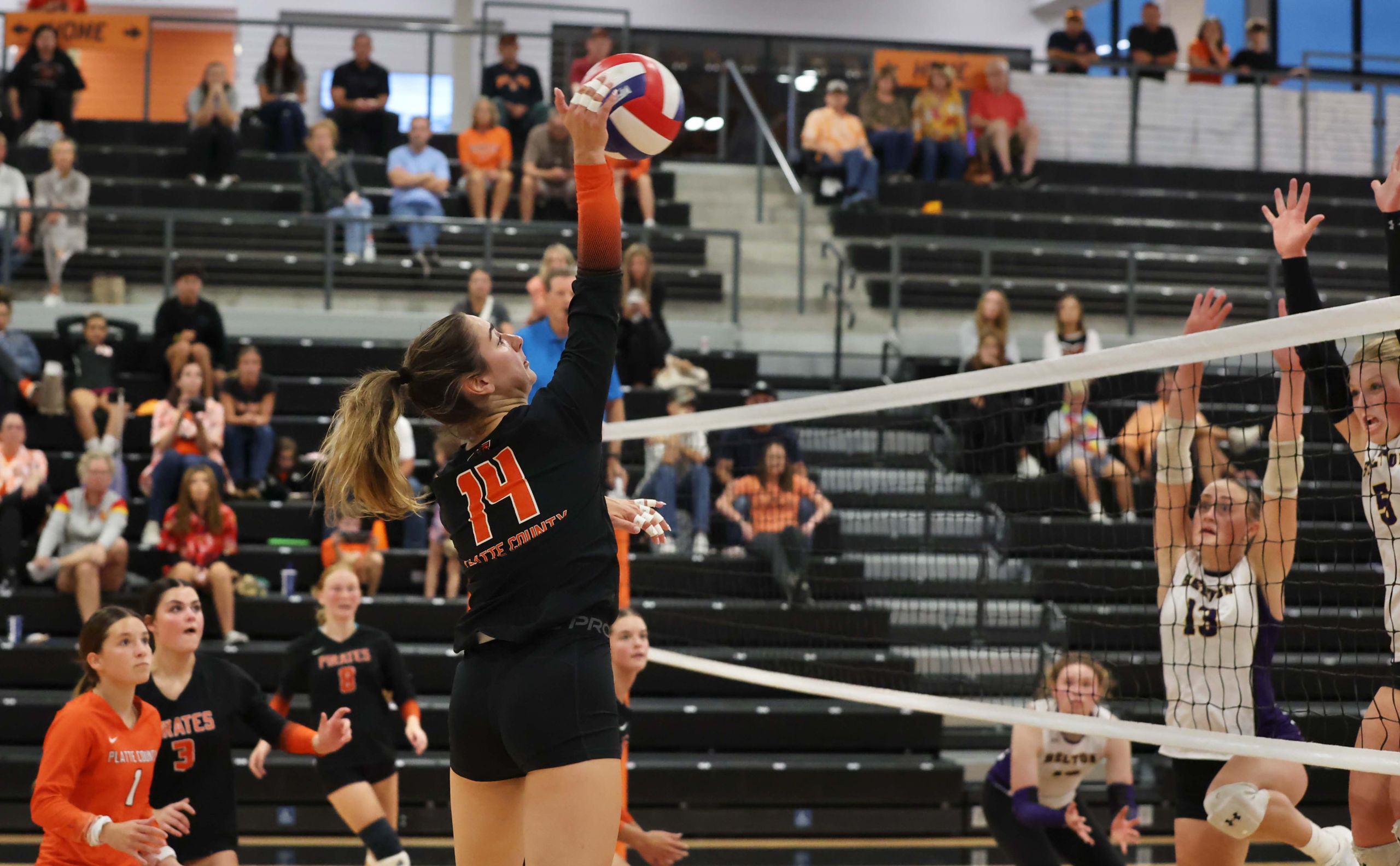 Platte County sophomore Ella Cruce hits a set against Belton on Tuesday night at Pirate Fieldhouse.