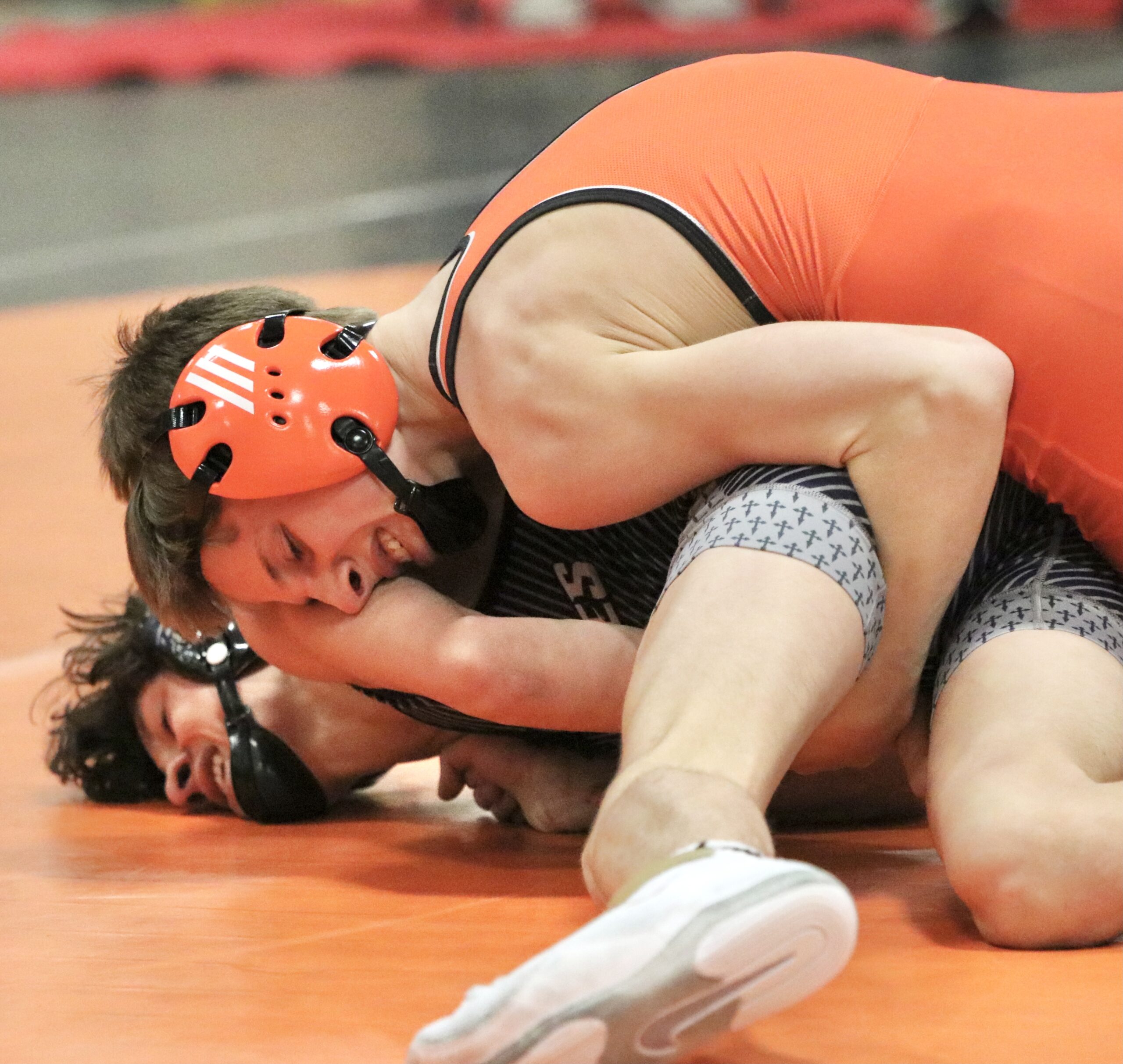 Platte County freshman Caden Hulett holds down St. James Academy sophomore Mio Cregan in the 106-pound match in a dual during the Platte County Invitational on Saturday at Platte County High School.