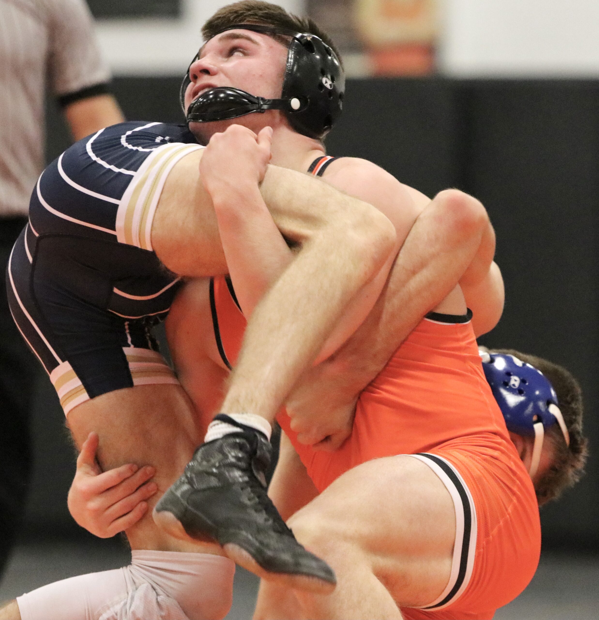 Platte County junior Jaydon Walls throws a cradle in the 195-pound match against St. James Academy during a dual in the Platte County Invitational on Saturday at Platte County High School.