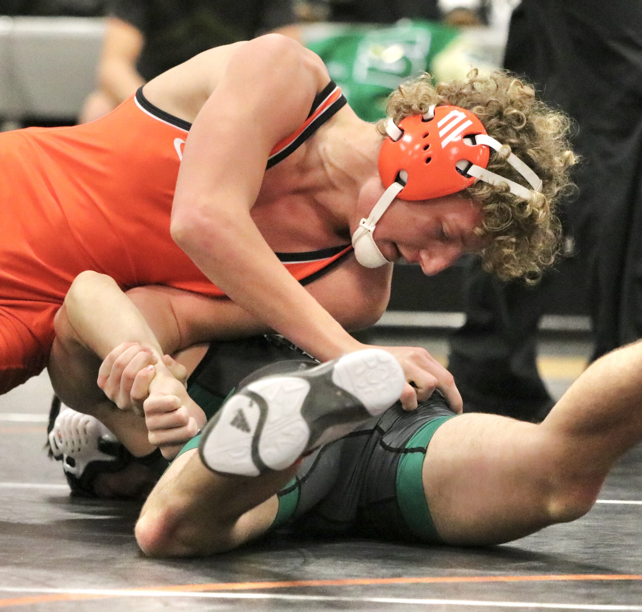 Platte County junior Blaine Keuhn works for a pin in a 170-pound match during a dual with Helias in the 48th annual Platte County Invitational on Saturday at Platte County High School.