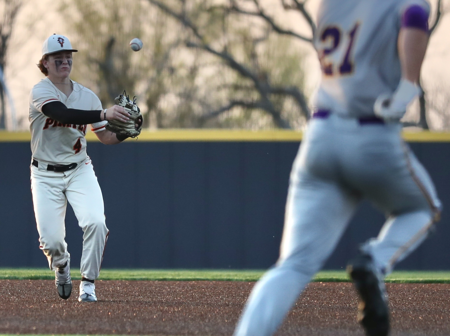Platte County sophomore second baseman Dayton Doll throws to first base for an out against Blue Springs on Monday at Platte County High School.