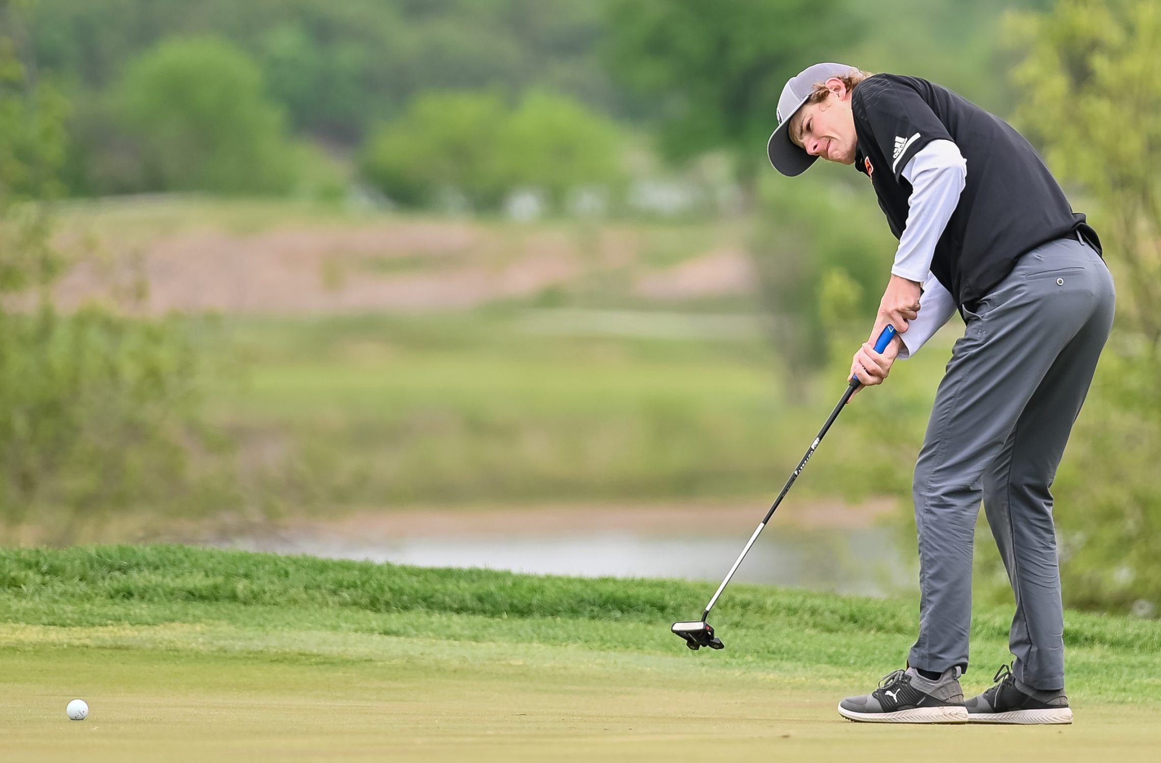 Platte County senior Evan Handke watches a putt during the Class 4 District 4 tournament Monday on The Posse Course at Paradise Pointe Golf Complex in Smithville.