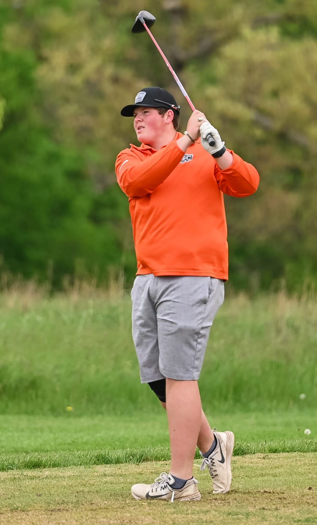 Platte County senior Grant Gomel watches a drive during the Class 4 District 4 tournament Monday at The Posse Course at Paradise Pointe Golf Complex in Smithville.