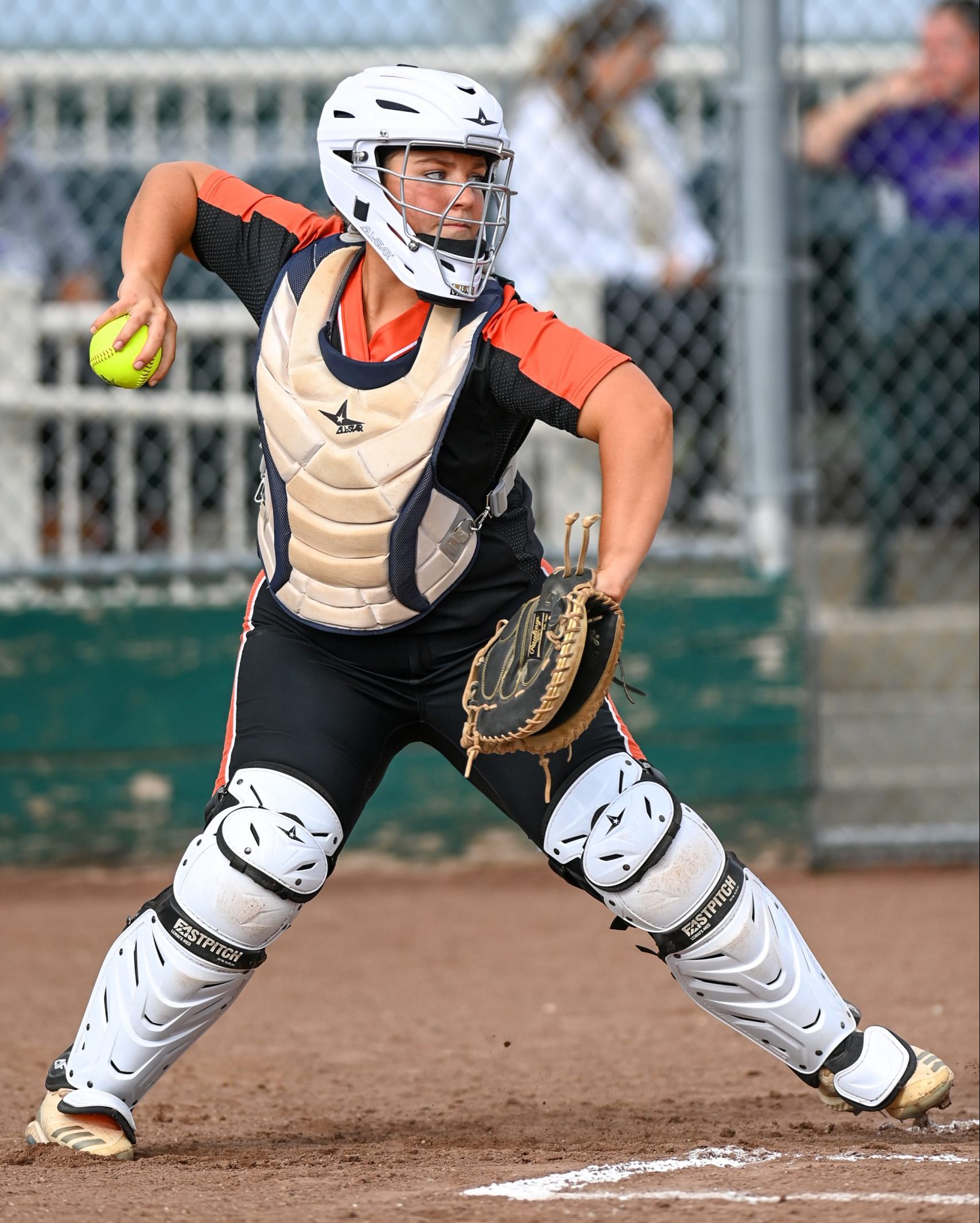 Platte County senior catcher Ali Gill prepares to make a throw against Kearney on Thursday at Platte Ridge Park.