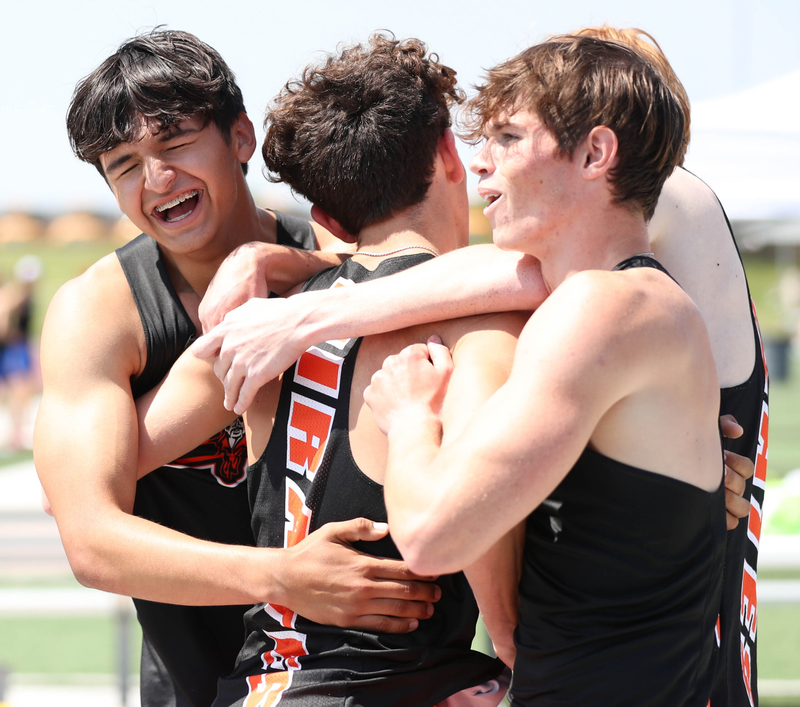 Members of Platte County’s 4×400-meter relay embrace after placing third Saturday in the Class 5 Sectional 4 meet at North Kansas City District Activities Complex in Kansas City.