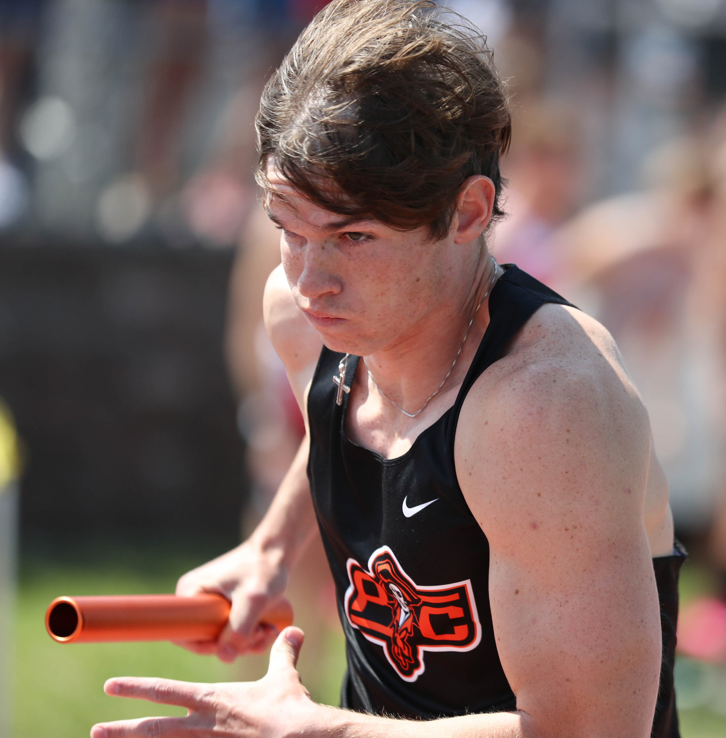 Platte County freshman Jackson Goodale runs the anchor of the 4×400-meter relay during the Class 5 Sectional 4 meet Saturday at North Kansas City District Activities Complex in Kansas City.