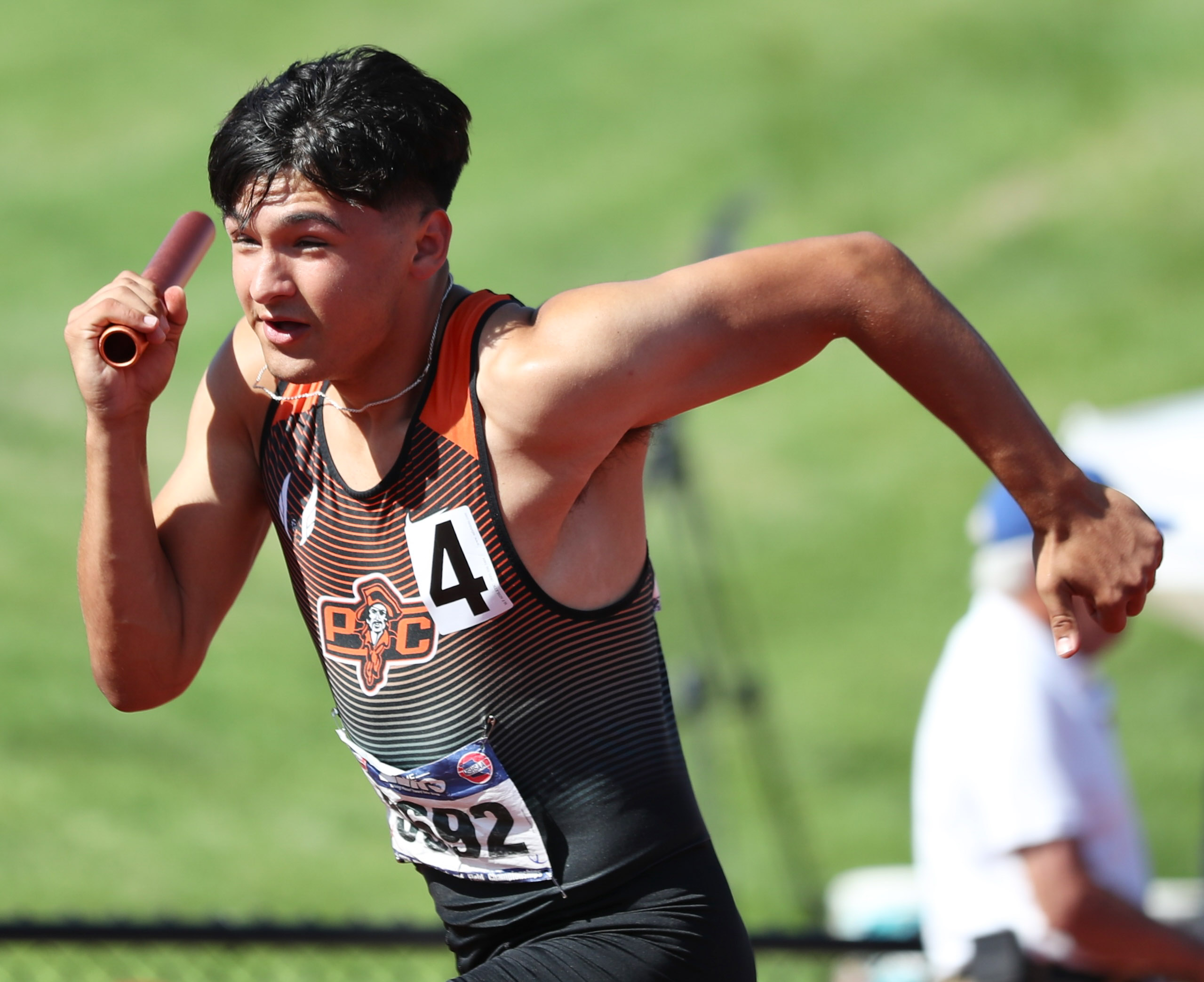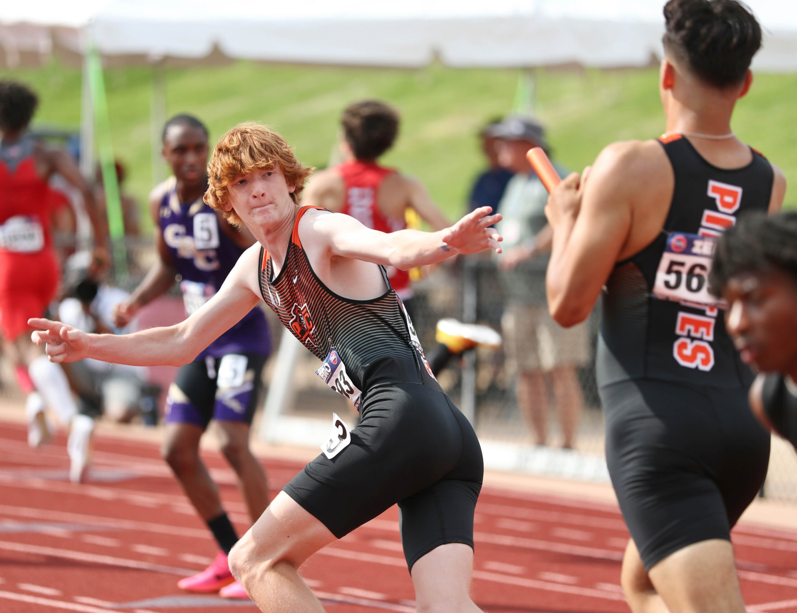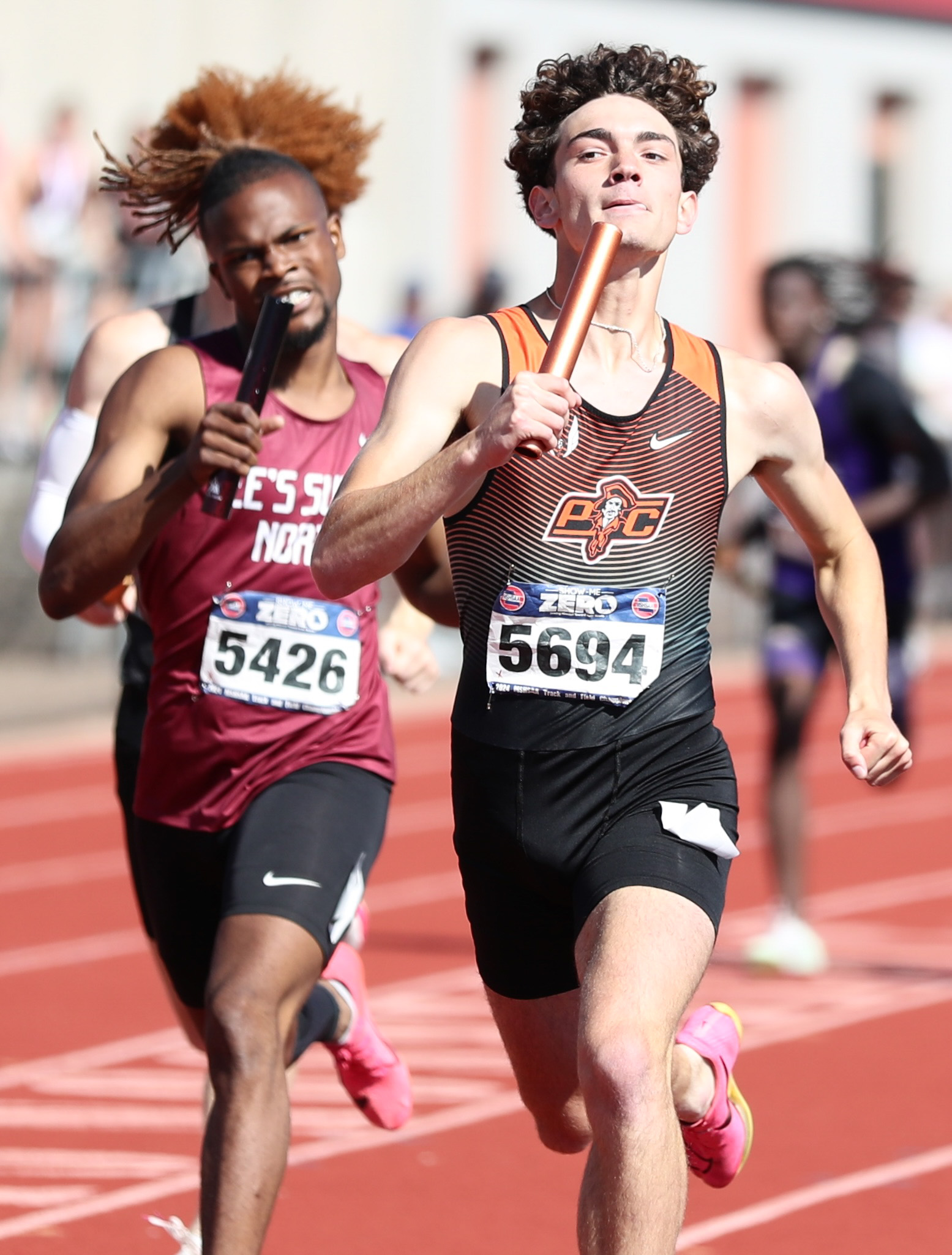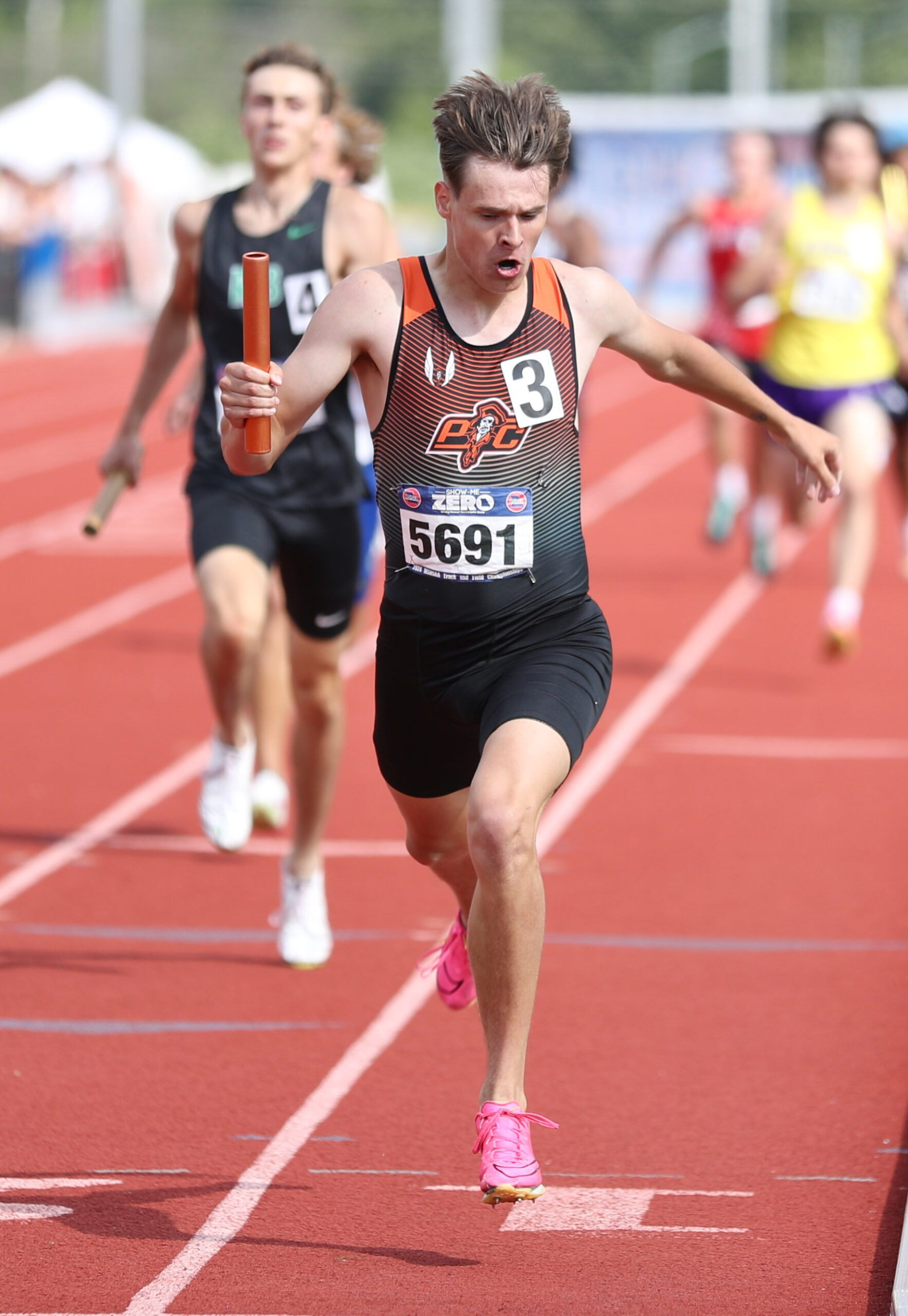 Platte County junior Josh Fraker takes the baton in the 4×400-meter relay preliminaries during the Class 5 MSHSAA Track and Field Championships on Friday at Jefferson City High School’s Adkins Stadium in Jefferson City.