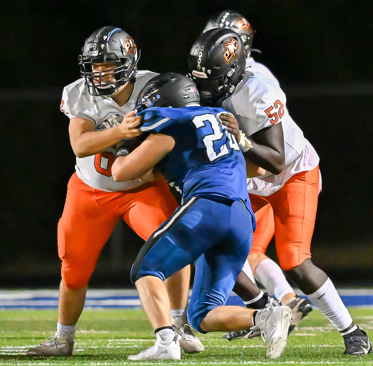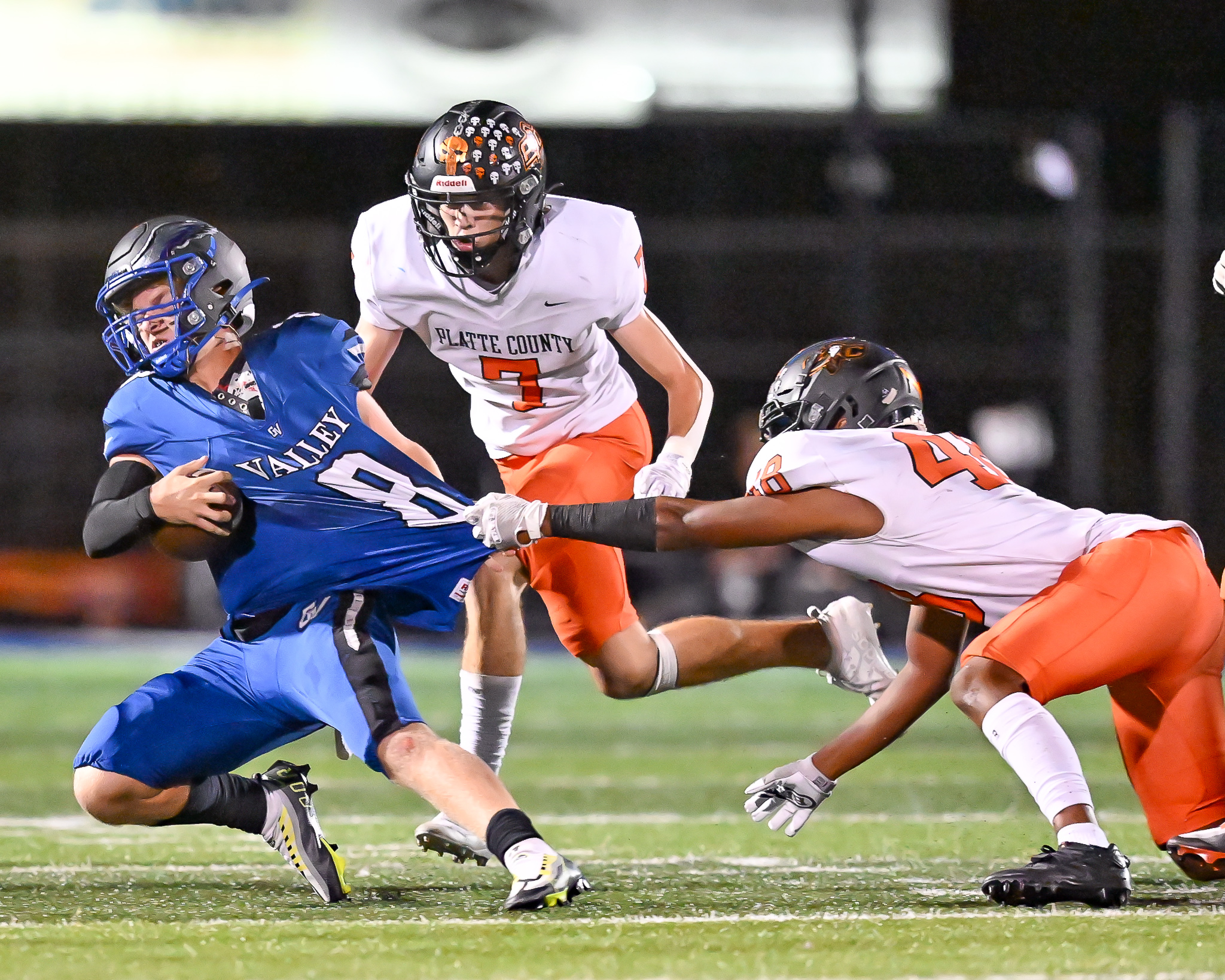 Without McDowell, Platte County again looked undersized against a trapping Grain Valley offensive line with senior Mar’Ques Brown (three tackles) and sophomore Kameron Doyle (two tackles for loss) starting inside, and junior Kohry Woessner (six tackles), Bradley (three tackles) and senior Blake Rueckert (three tackles) frequently rotating inside and out and Fulk (one tackle) contributing as a defensive tackle.