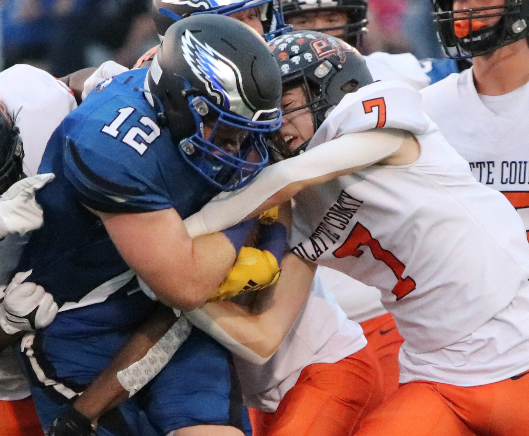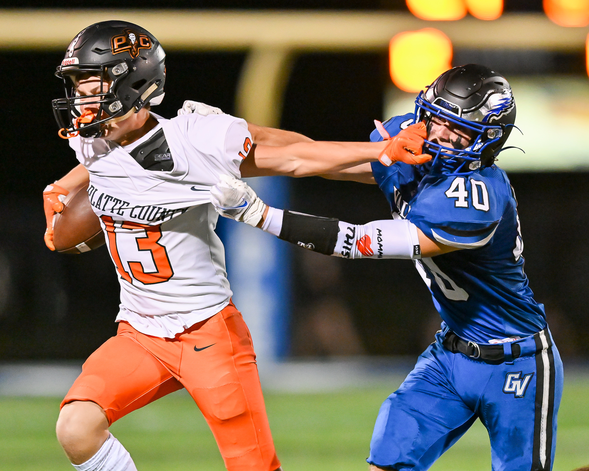 Platte County senior safety Andy McClure attempts to rip the ball away from Grain Valley junior running back Ty Williams on Friday at Grain Valley High School.