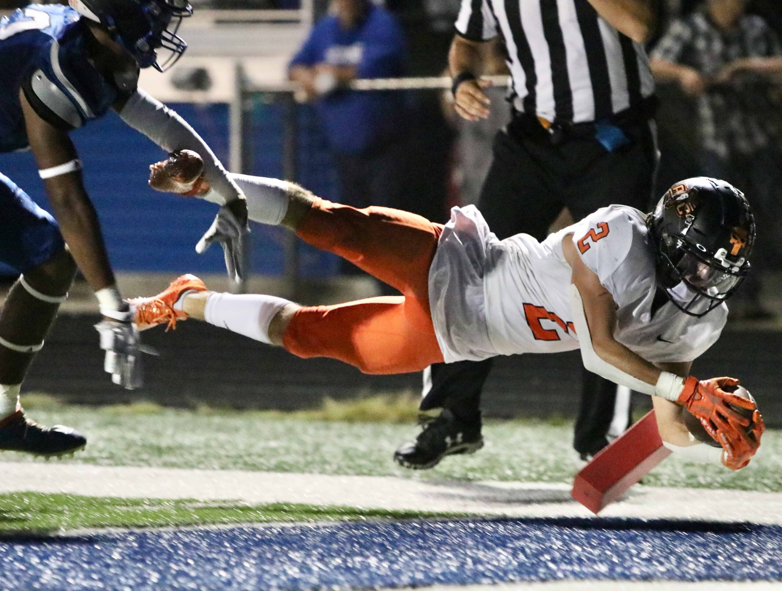 Platte County senior running back Nate Walls dives for the pylon and a touchdown against Grain Valley on Friday at Grain Valley High School.