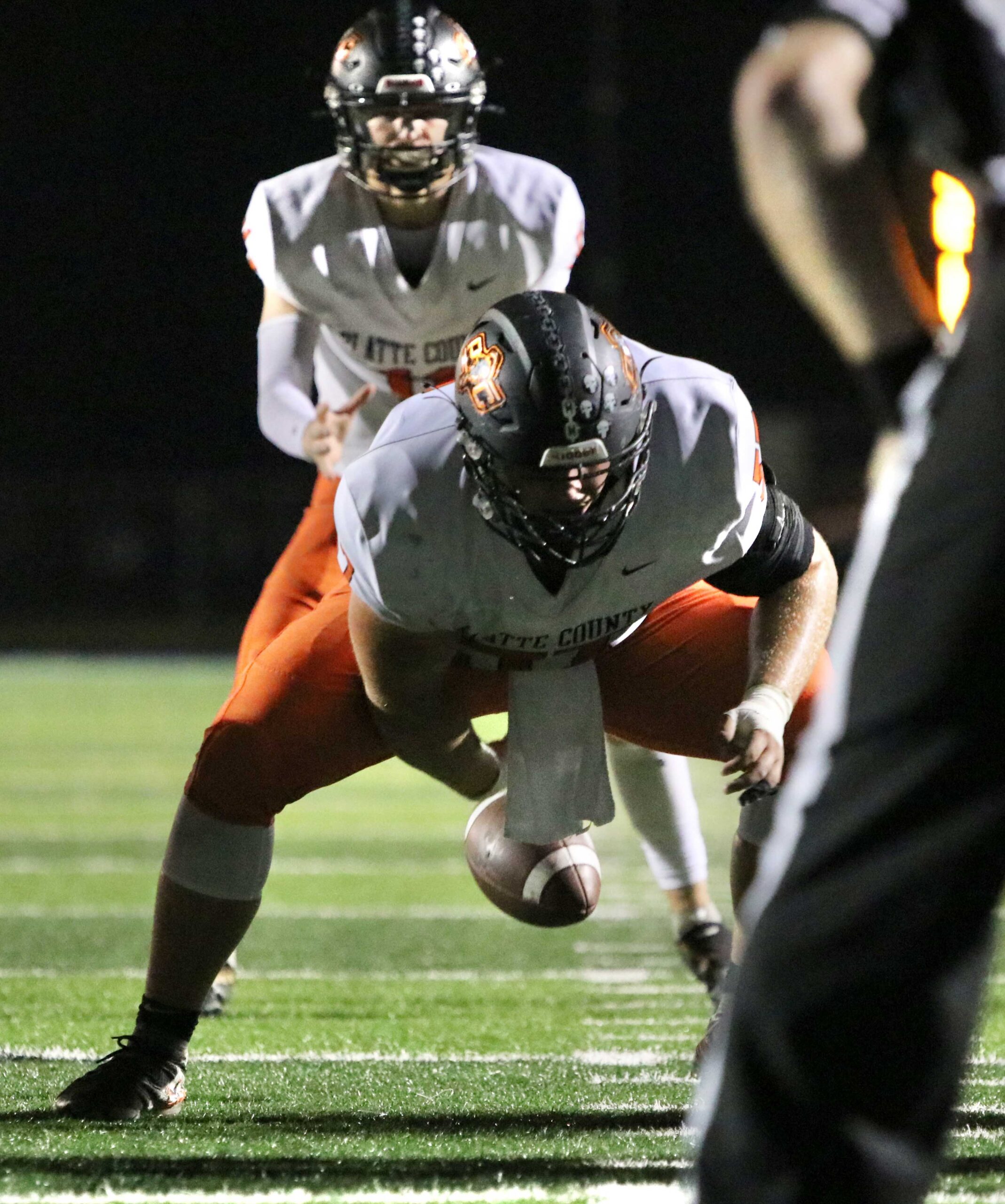 Platte County senior Braden Parker snaps the ball in the red zone to senior quarterback Dylan Zimmerman against Grain Valley on Friday at Grain Valley High School.