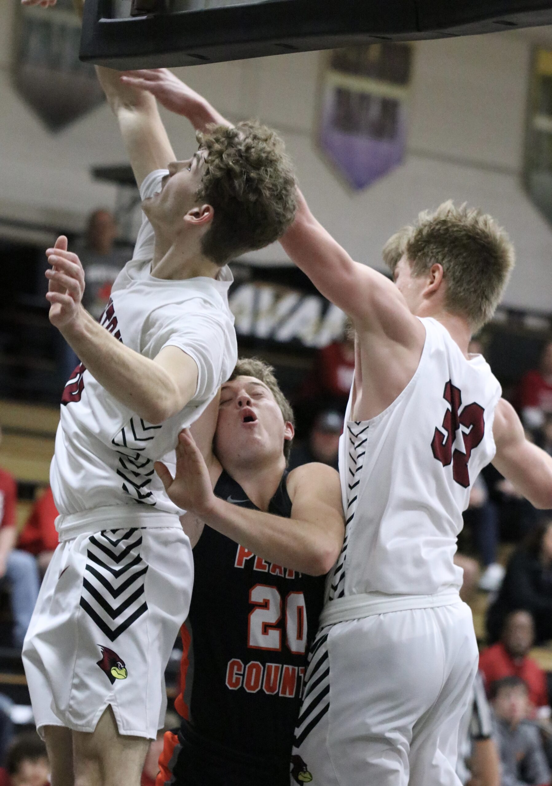 Platte County senior forward Brody Fulk absorbs contact between two Benton defenders while taking a shot during the Savannah Invitational title game on Saturday in Savannah.