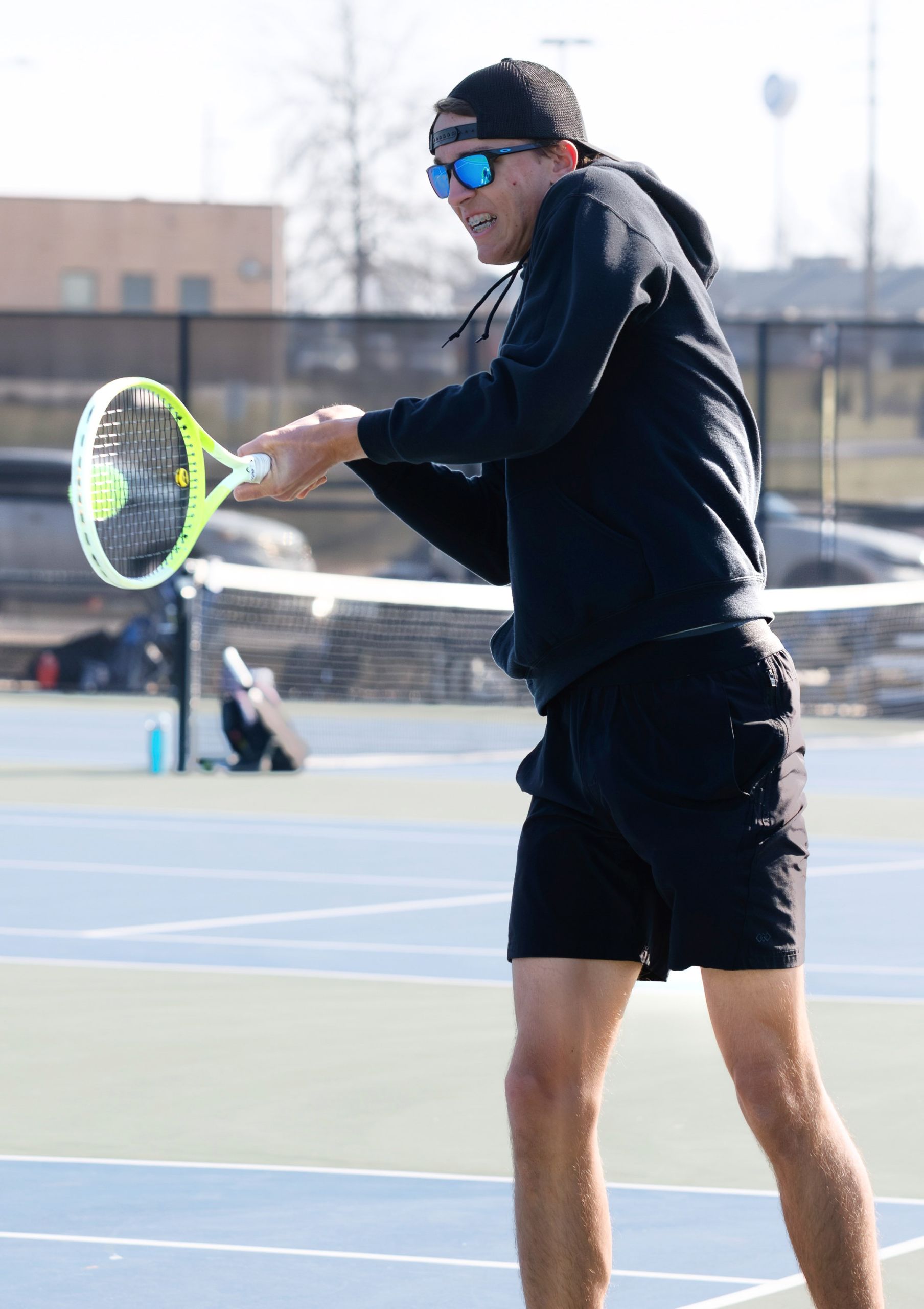 Platte County junior Mitchel McBratney hits a backhand shot during a singles match in the Platte County Invitational on Wednesday at Platte County High School.