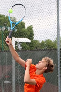 Platte County freshman Gavin Nichols hits a serve during a Class 2 Missouri State Tennis Championships singles match last week at Cooper Tennis Complex in Springfield.