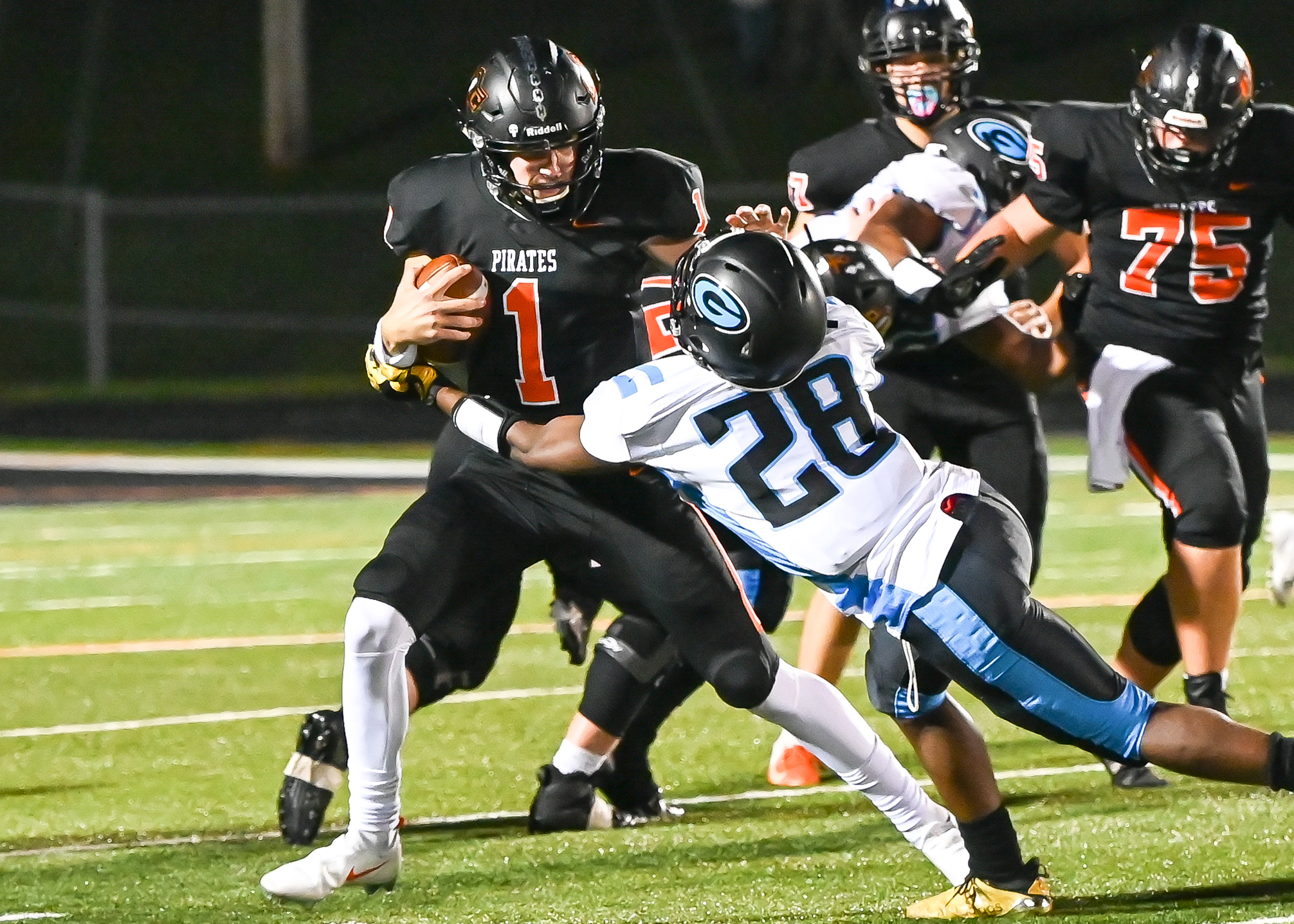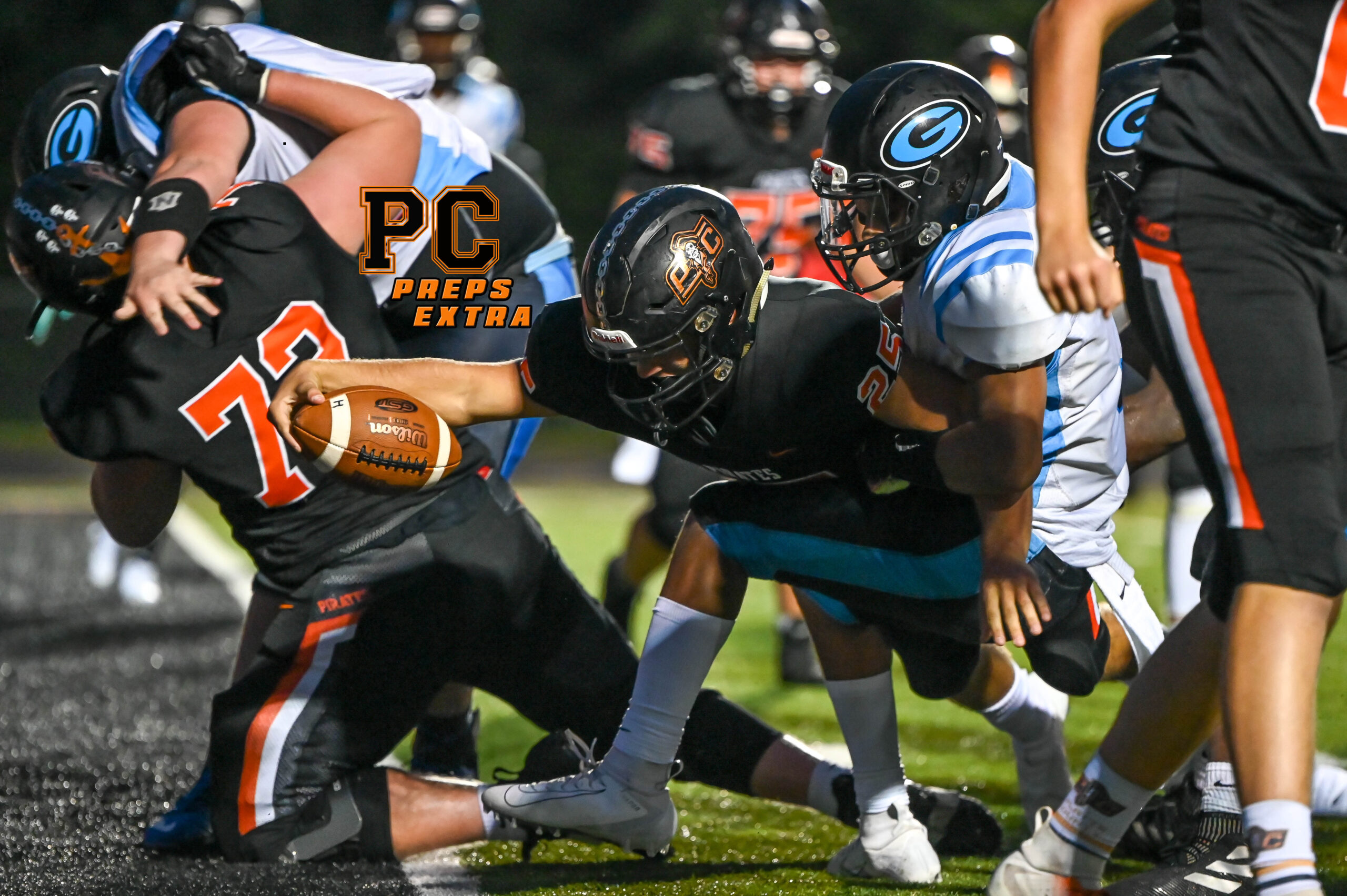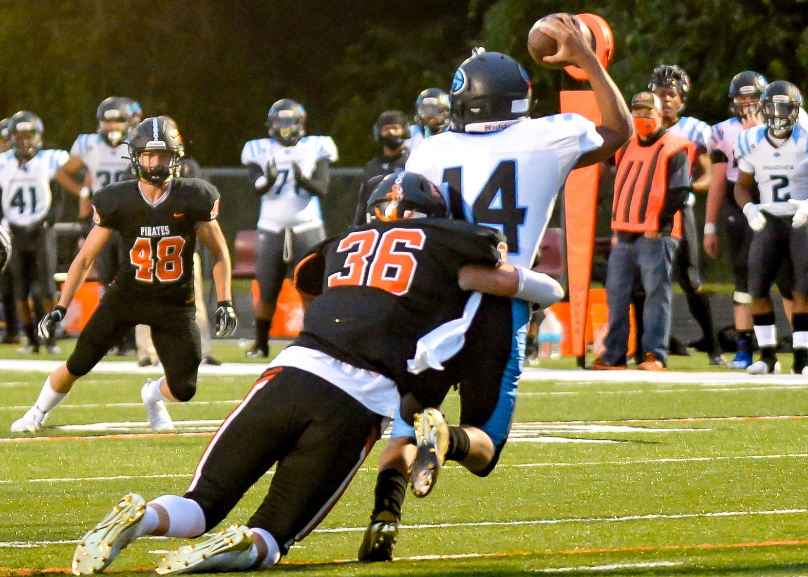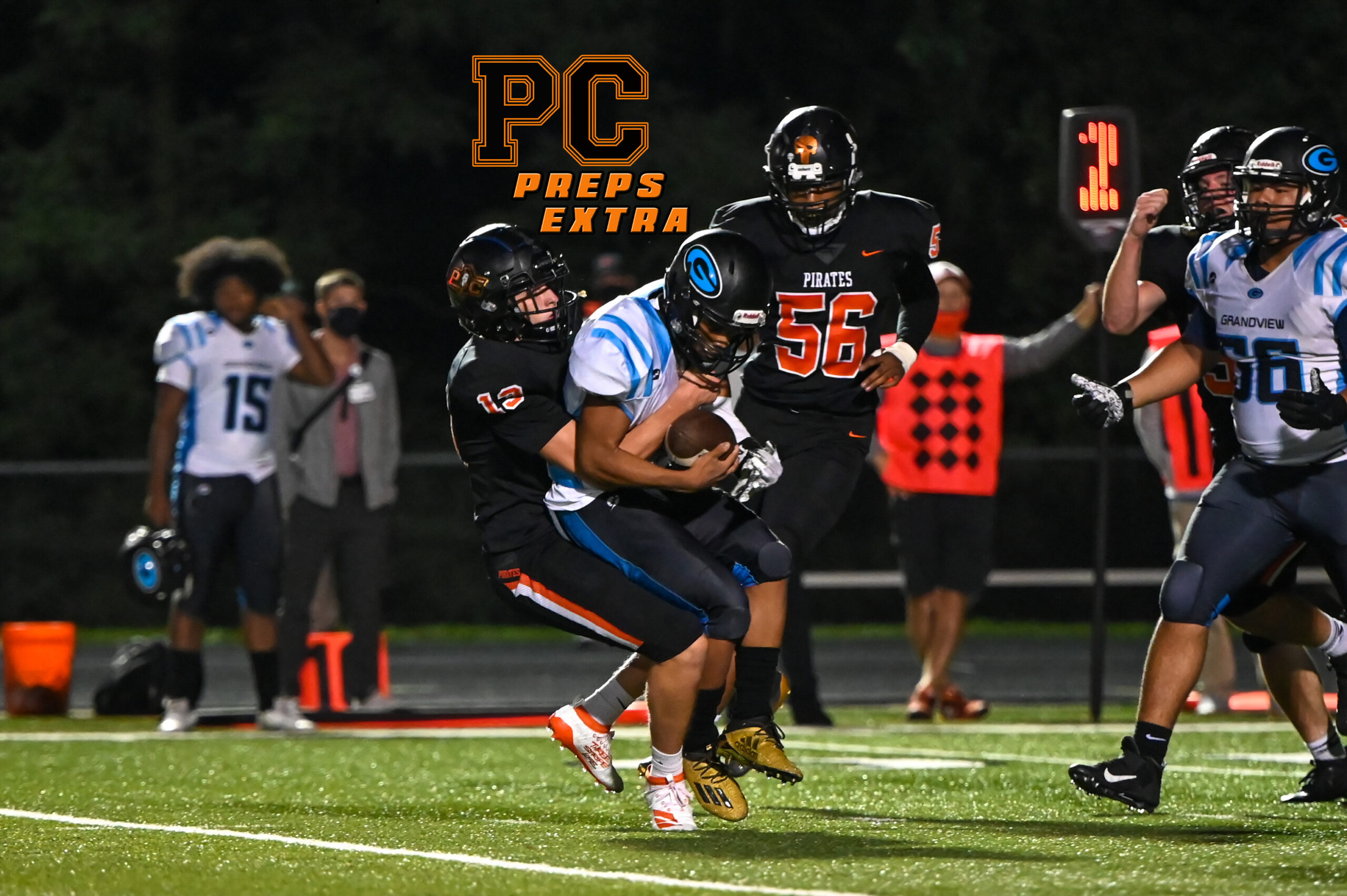 Platte County defeated Grandview 35-12 on Friday night at Pirate Stadium, improving to 3-0 on the season and 2-0 in Suburban Conference Blue Division play. For more photos and to purchase high-res versions, please visit Todd Nugent’s gallery at this link.