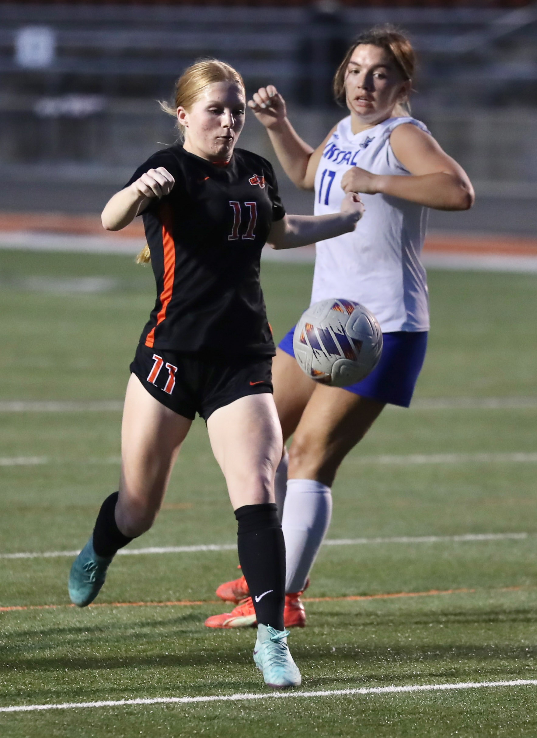 Platte County junior defender Madison Palmer prepares to take a shot against Central (St. Joseph) on Monday at Pirate Stadium.