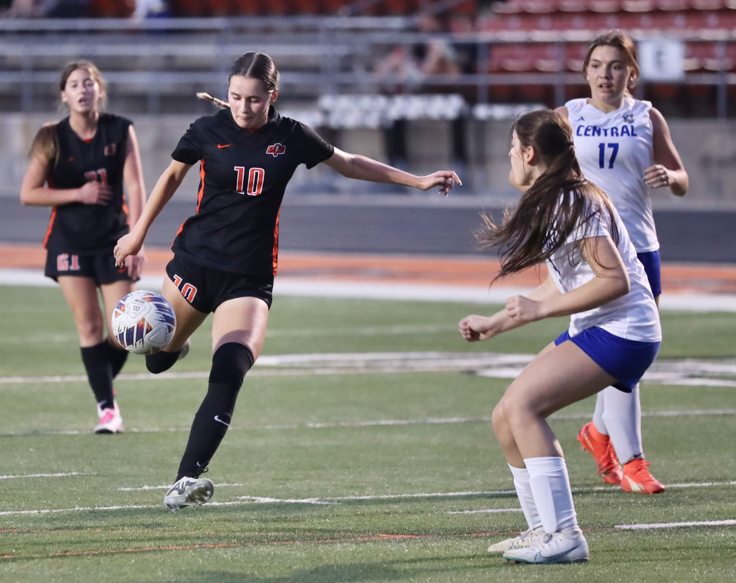 Platte County senior midfielder Addsion Sloan flicks a pass against Central (St. Joseph) on Monday at Pirate Stadium.