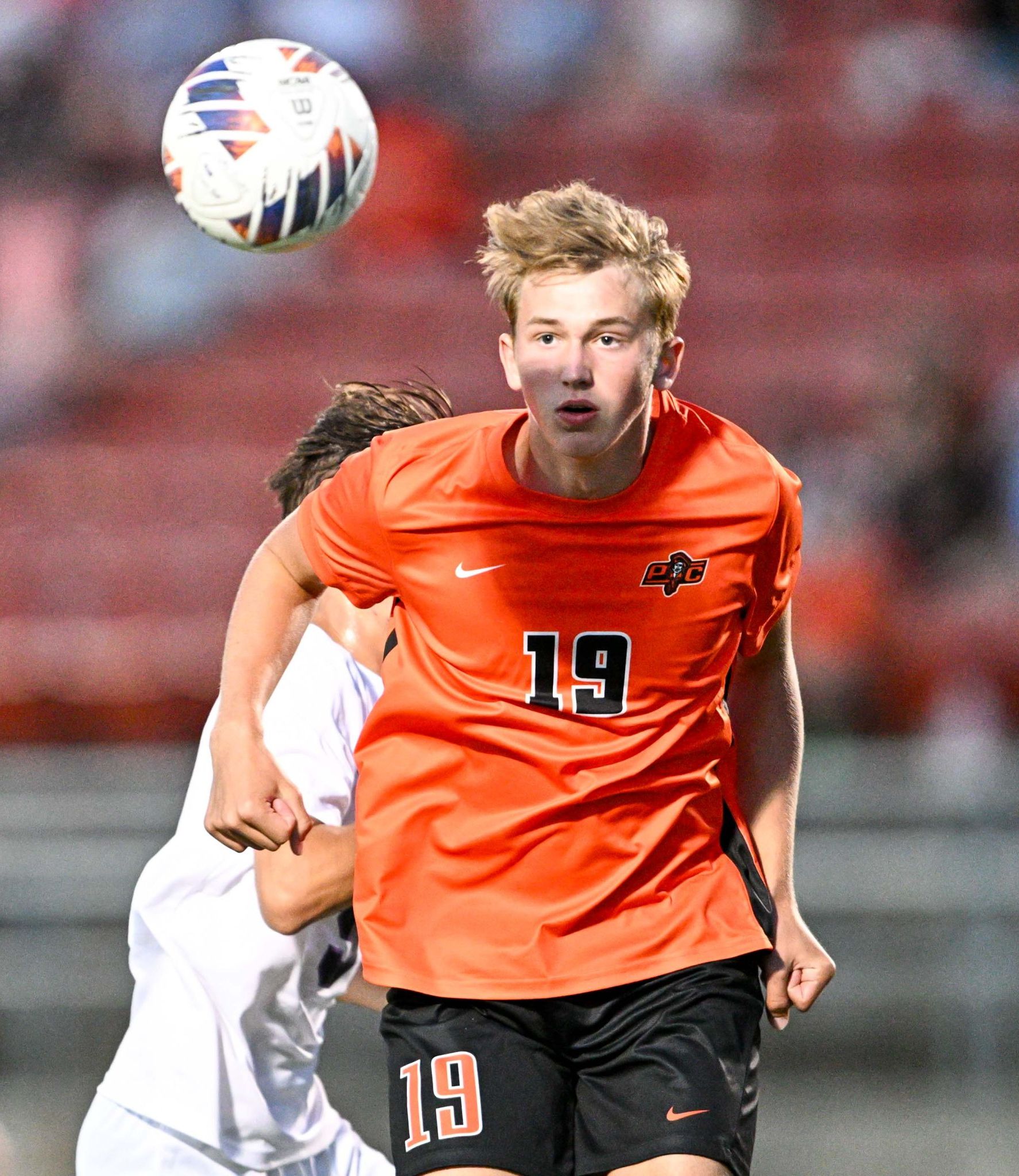 Platte County senior defender Wally Baldwin hits a clearance against Kearney on Monday night at Pirate Stadium.