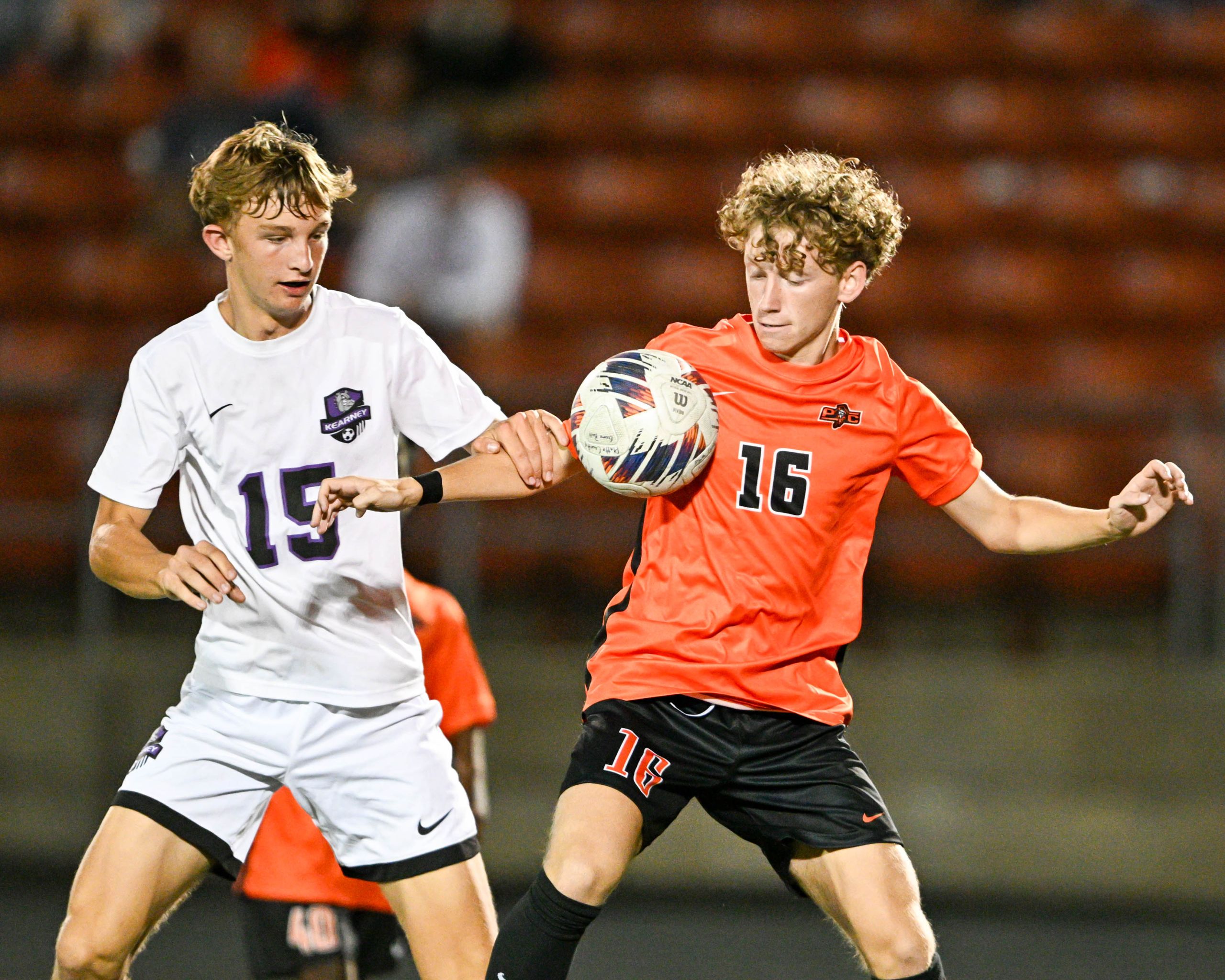 Platte County senior midfielder Abe Norman battles for a loose ball against Kearney on Monday at Pirate Stadium.