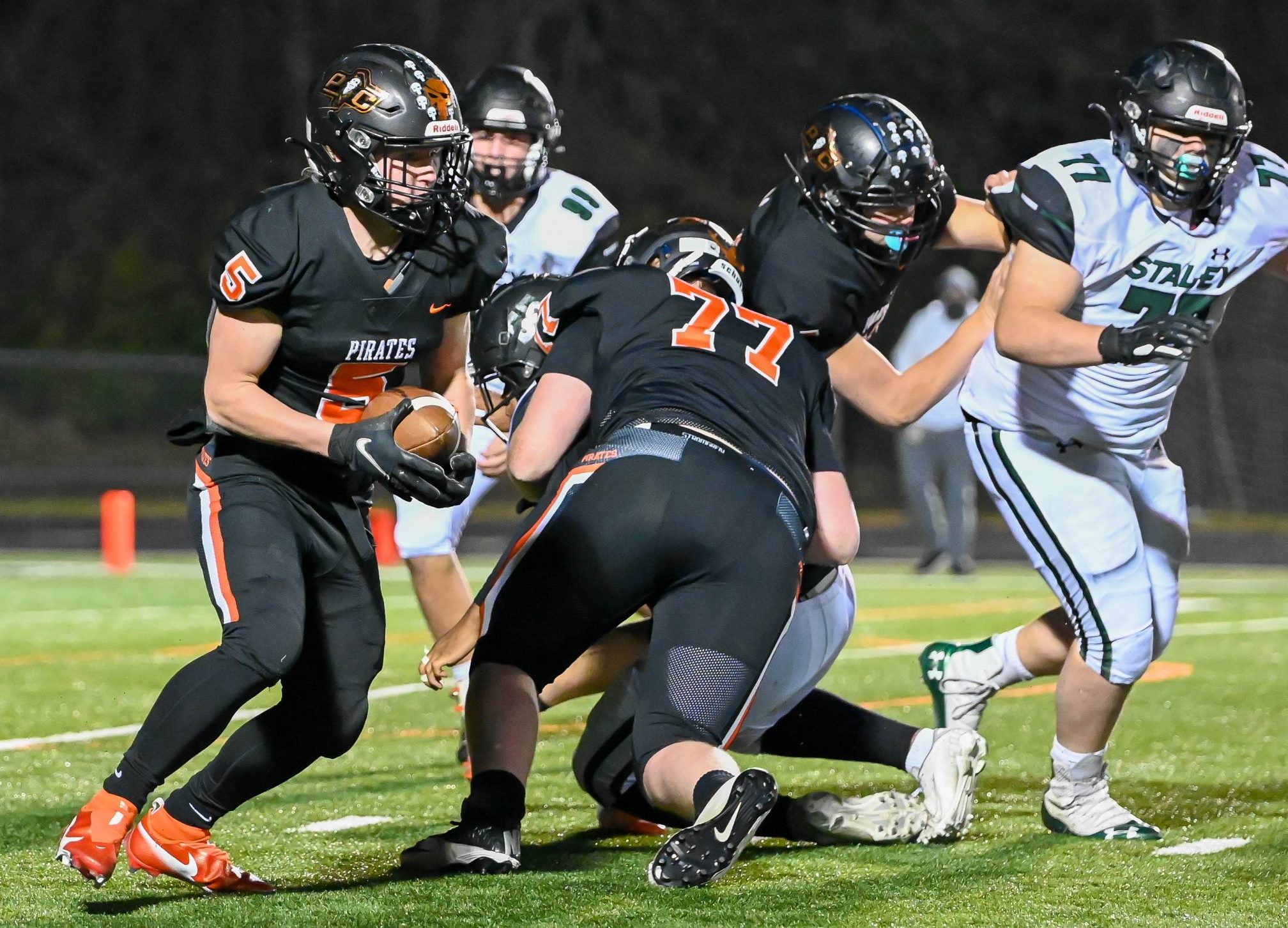 Platte County’s defense proved especially important the tumultuous first half. After the exchange of punts to open the game, the Pirates drove deep into Staley territory only for Ruhnke to have a first-and-15 pass from the 25 picked off for the game’s first turnover.