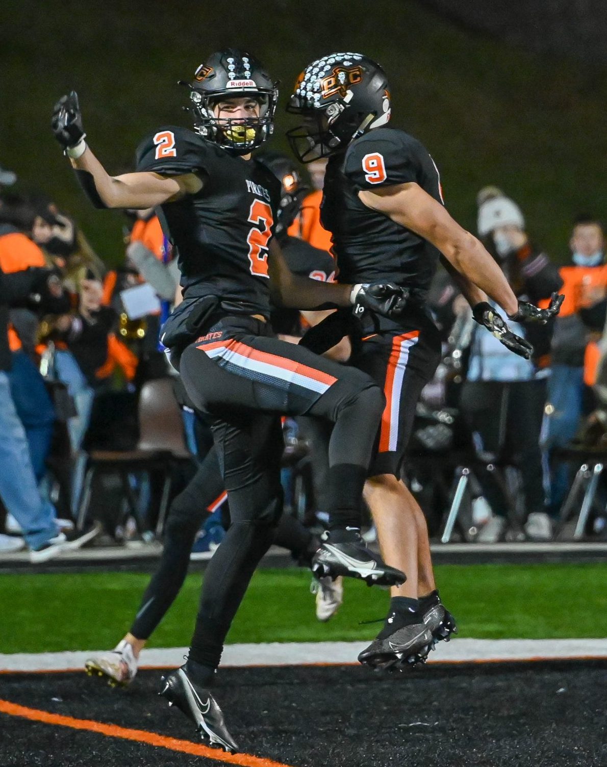Platte County senior wide receivers Colby Rollins, left, and Dayton Mitchell celebrate a touchdown reception from Rollins against Staley in The Class 5 District 8 championship game Friday at Pirate Stadium.