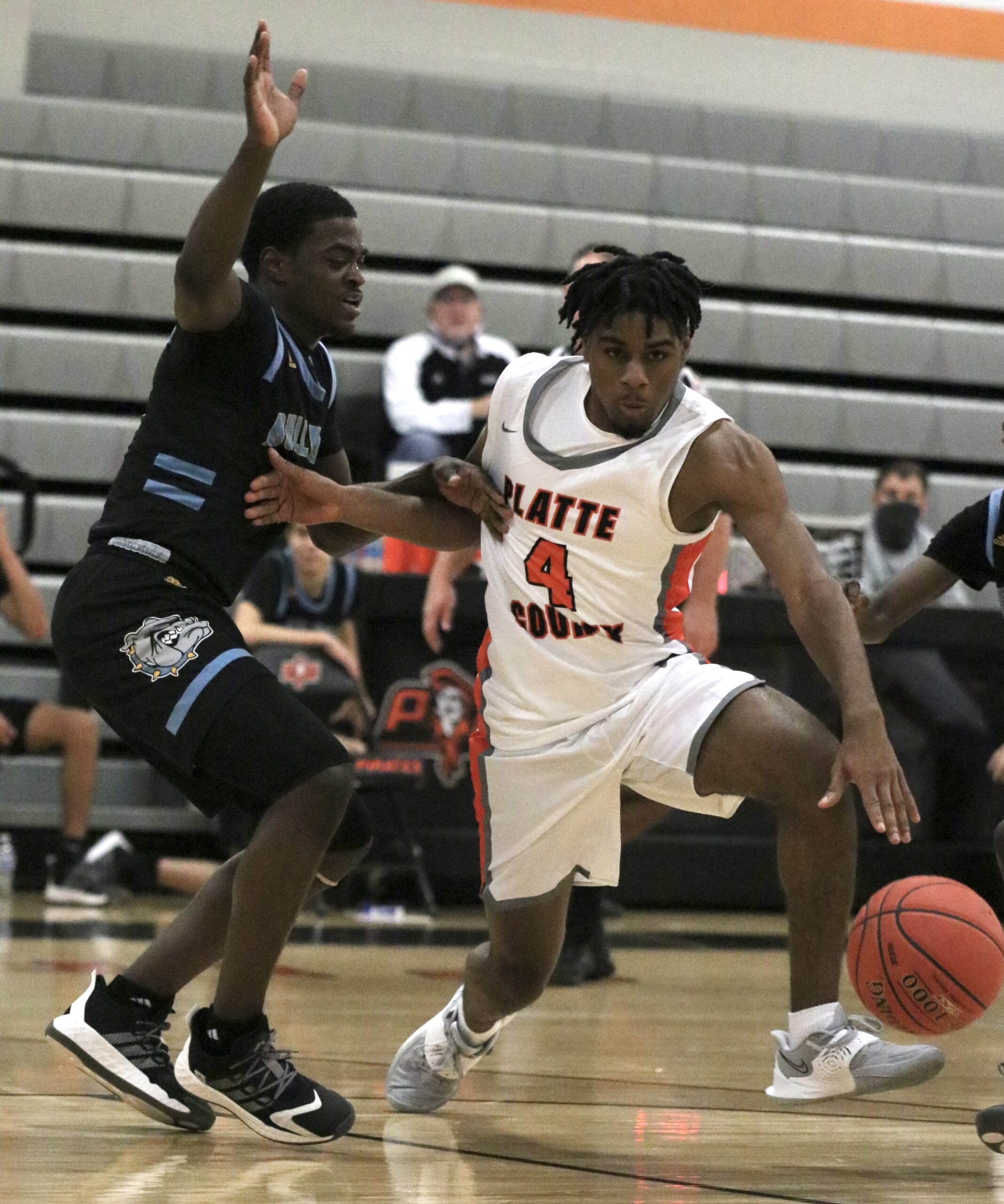 Platte County senior guard Jaden Burnett tries to dribble away from a Grandview defender on Tuesday at Platte County High School.