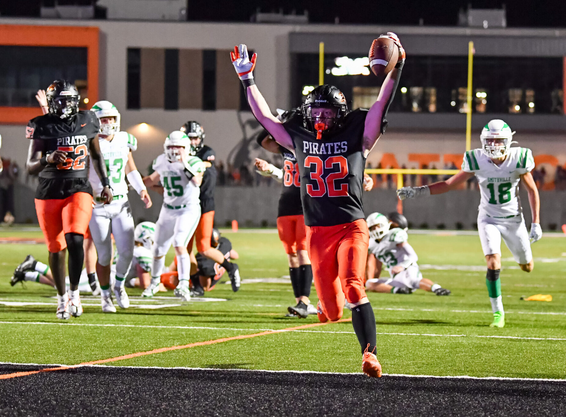 Marriott scrambled 22 yards around left end on the next play before going out of bounds. He then lofted what looked like a dangerous pass to wide receiver Lane Webb for 16 yards down to the 28. The Pirates took a timeout, and Smithville came out of the stoppage with 12 men on the field and gave up five more yards.