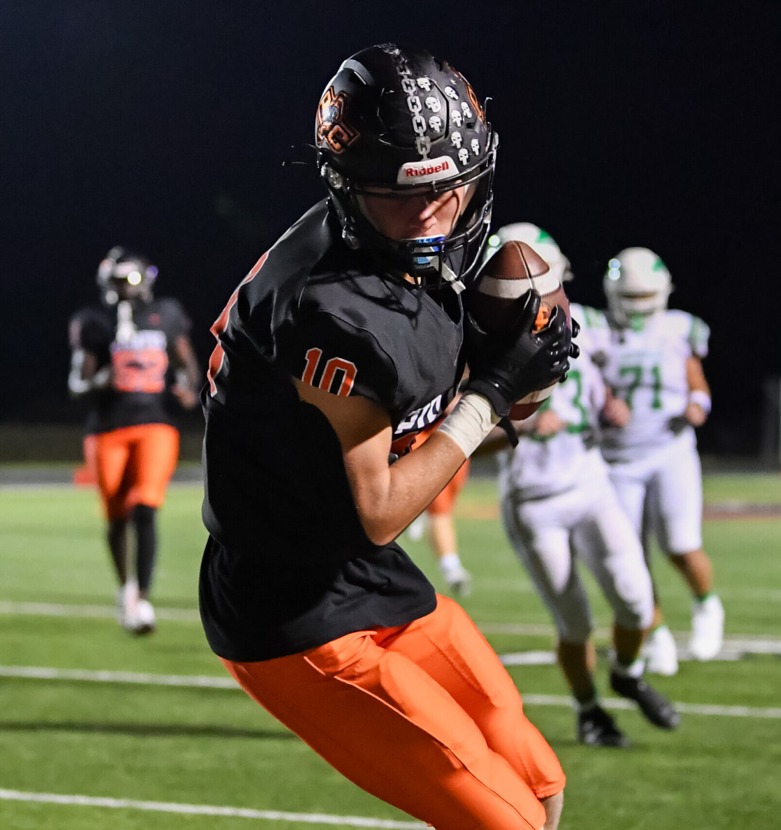 Platte County sophomore tight end Brooks Hall reels in a catch along the sideline on Friday night against Smithville at Pirate Stadium.