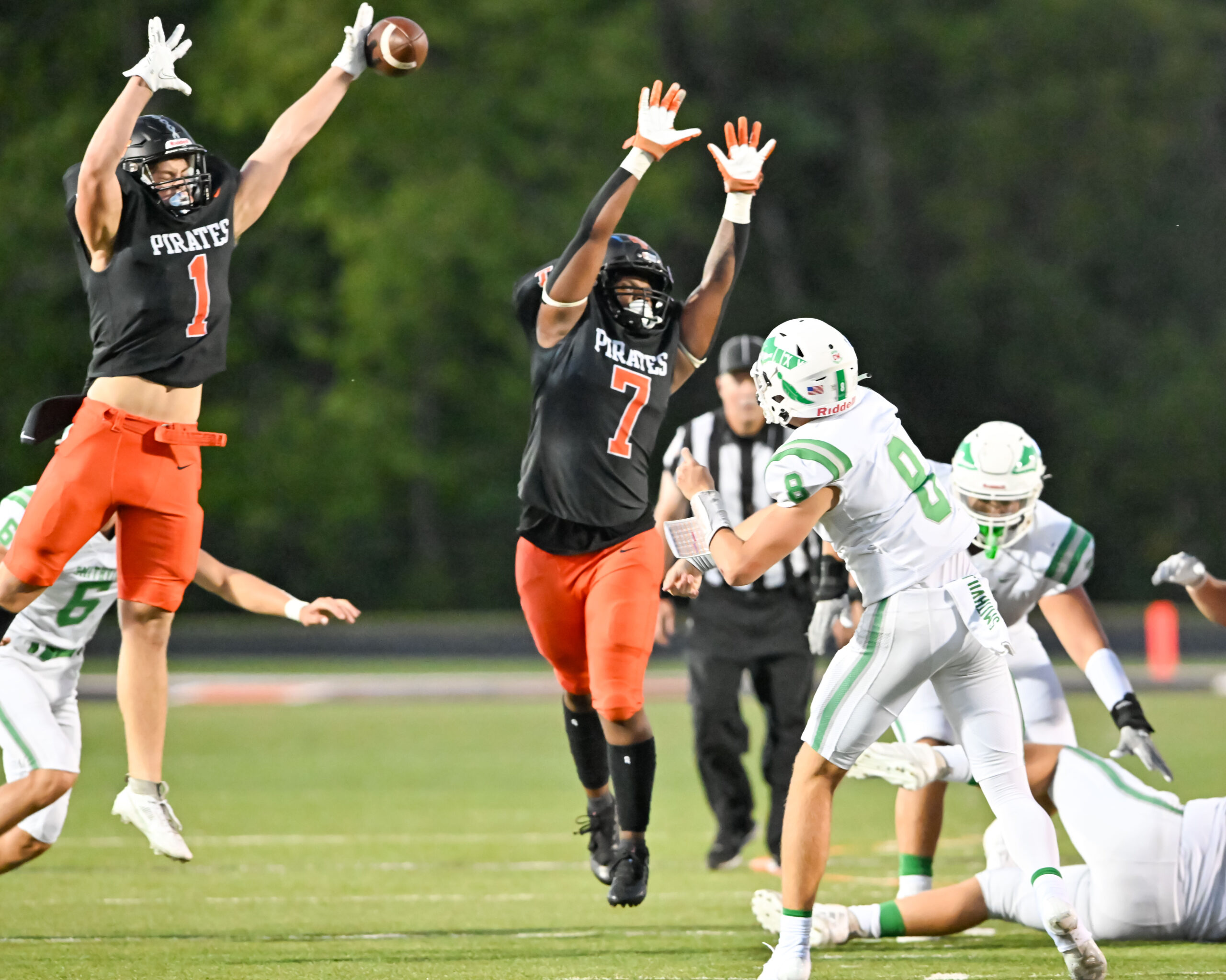Platte County’s offensive line remained static for a second straight week with seniors Muyonta Maxwell (left tackle), Gage Fulk (right tackle) and Becker Grego (center) split inside and outside of junior guards Riley Hixson and Drew Doll. Only Maxwell was a full-time starter last year, and the Pirates remain without sophomore expected starter Quinn Lightle (knee), who should return at some point mid-season.