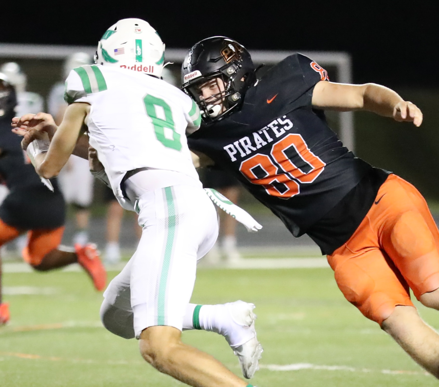 Platte County senior defensive end Tucker McDowell looks to make a tackle against Smithville on Friday night at Pirate Stadium.