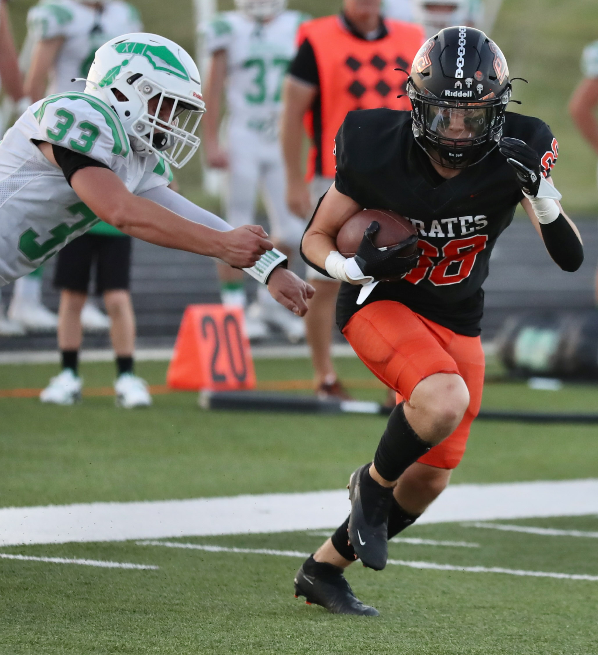 Platte County sophomore tight end Jack Utz runs up field after making a catch against Smithville on Friday at Pirate Stadium.