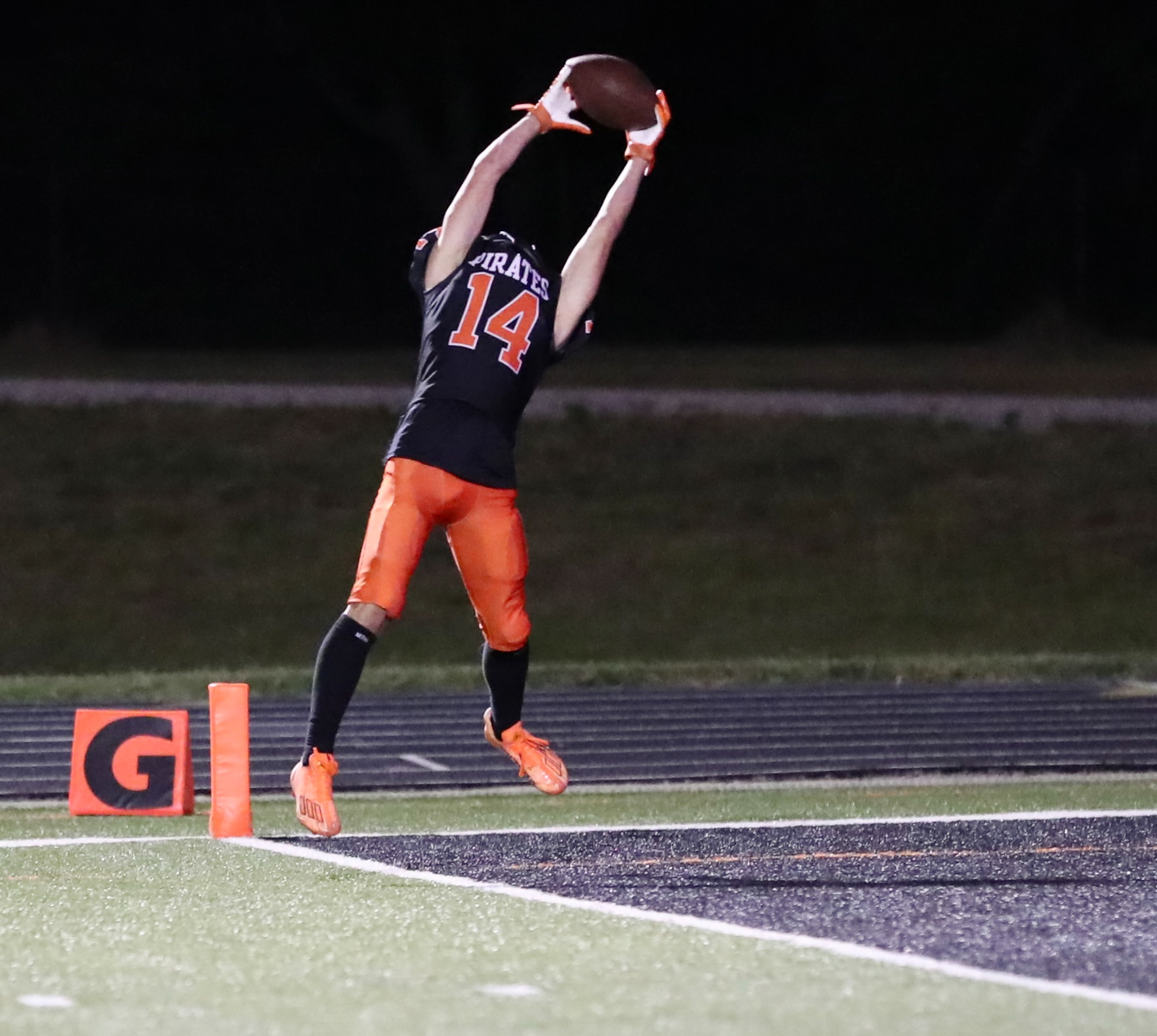 Platte County sophomore wide receiver Braiden Stevens hauls in the game-winning touchdown Friday against Smithville at Pirate Stadium.
