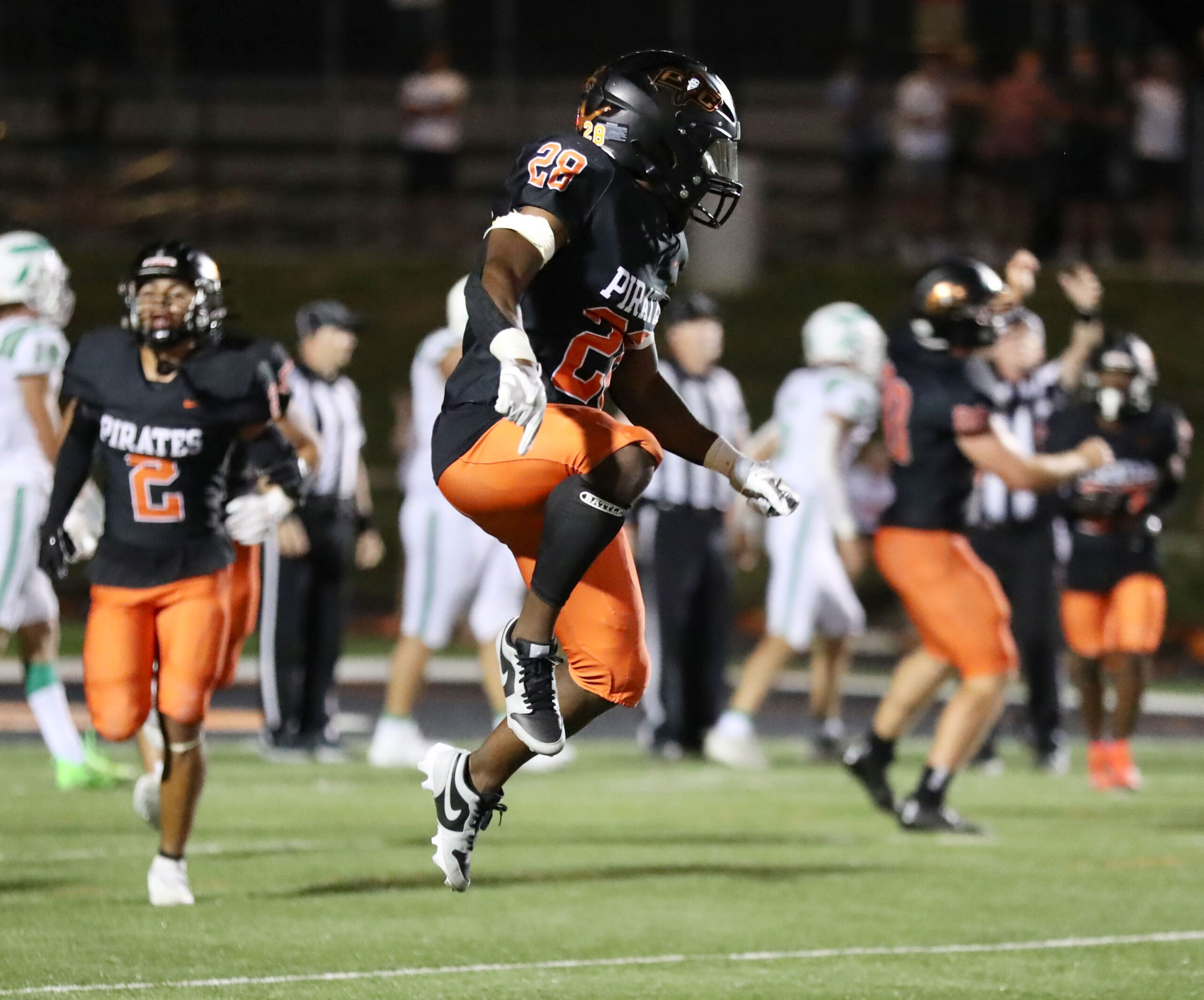 Platte County junior linebacker Darrell Smith celebrates a turnover in the second half against Smithville on Friday night at Pirate Stadium.