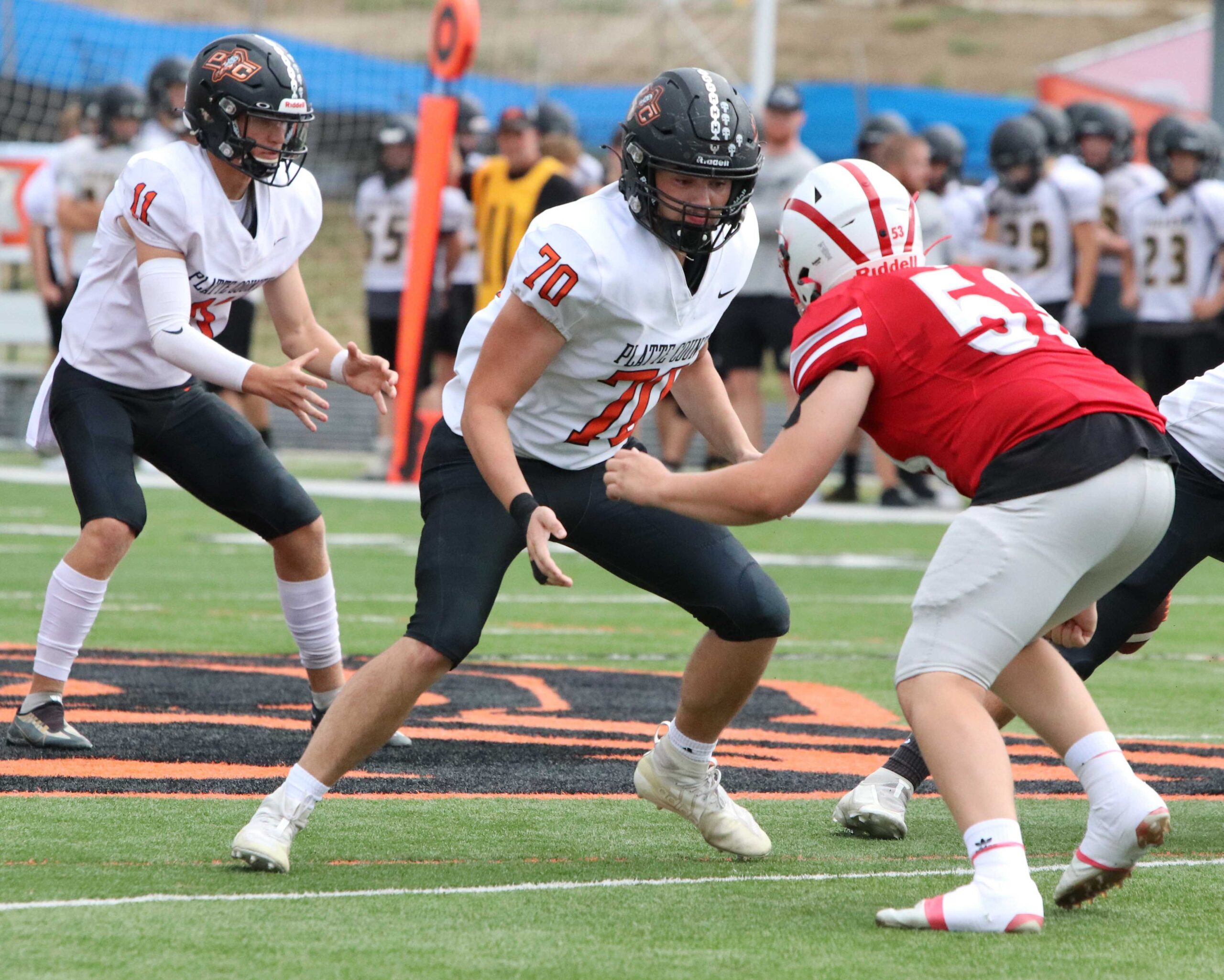 Platte County senior tackle Sage Lutz sets up to block during the preseason jamboree last Friday at Pirate Stadium.