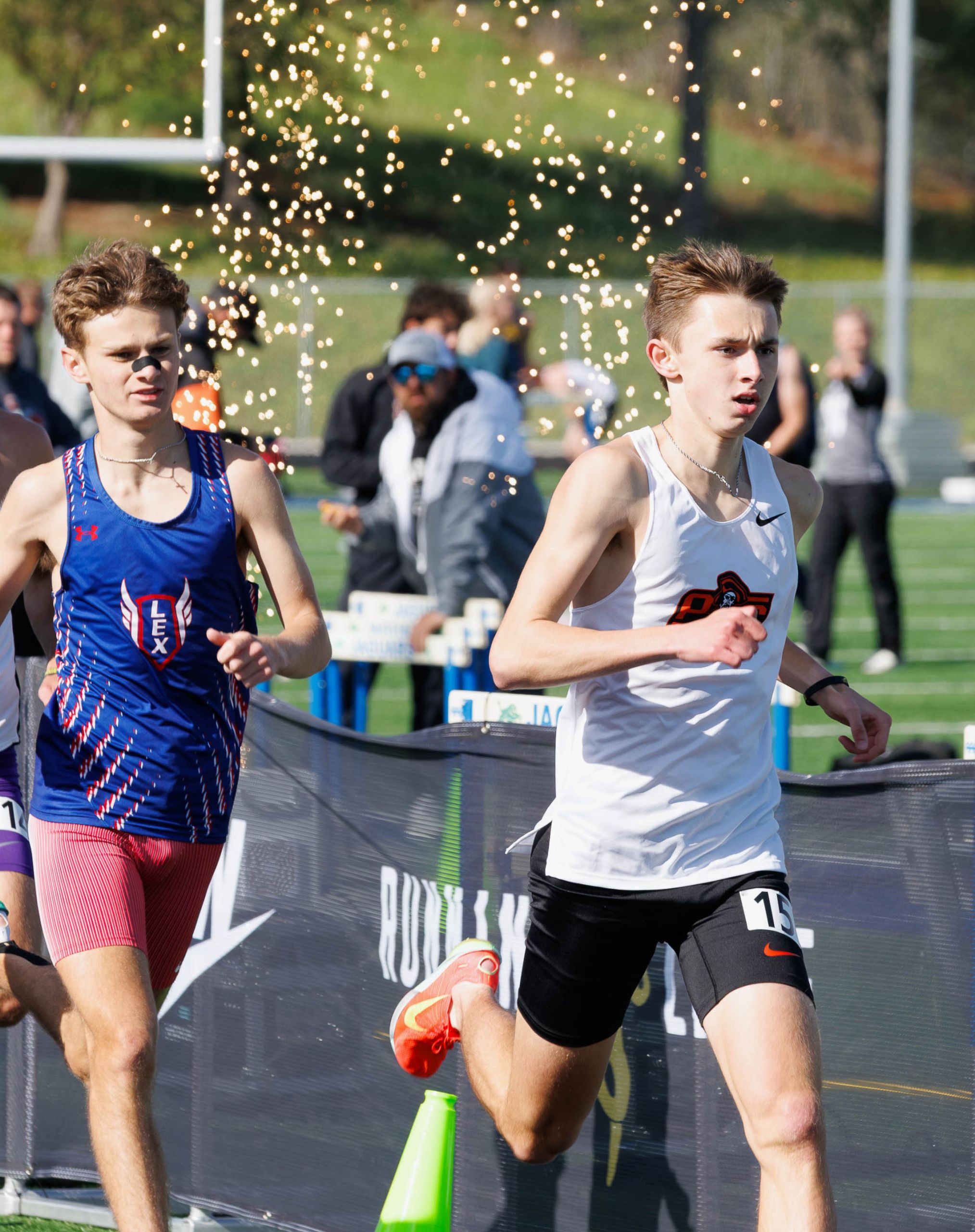Platte County senior Elijah Jackson finishes the 800-meter race with pyrotechnics going off in the background Saturday during the Kansas City Relays at Blue Springs South High School.