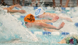 Platte County freshman Palmer Keith swims in the 100-yard butterfly finals in the North Kansas City Invitational on Saturday at Gladstone Community Center.