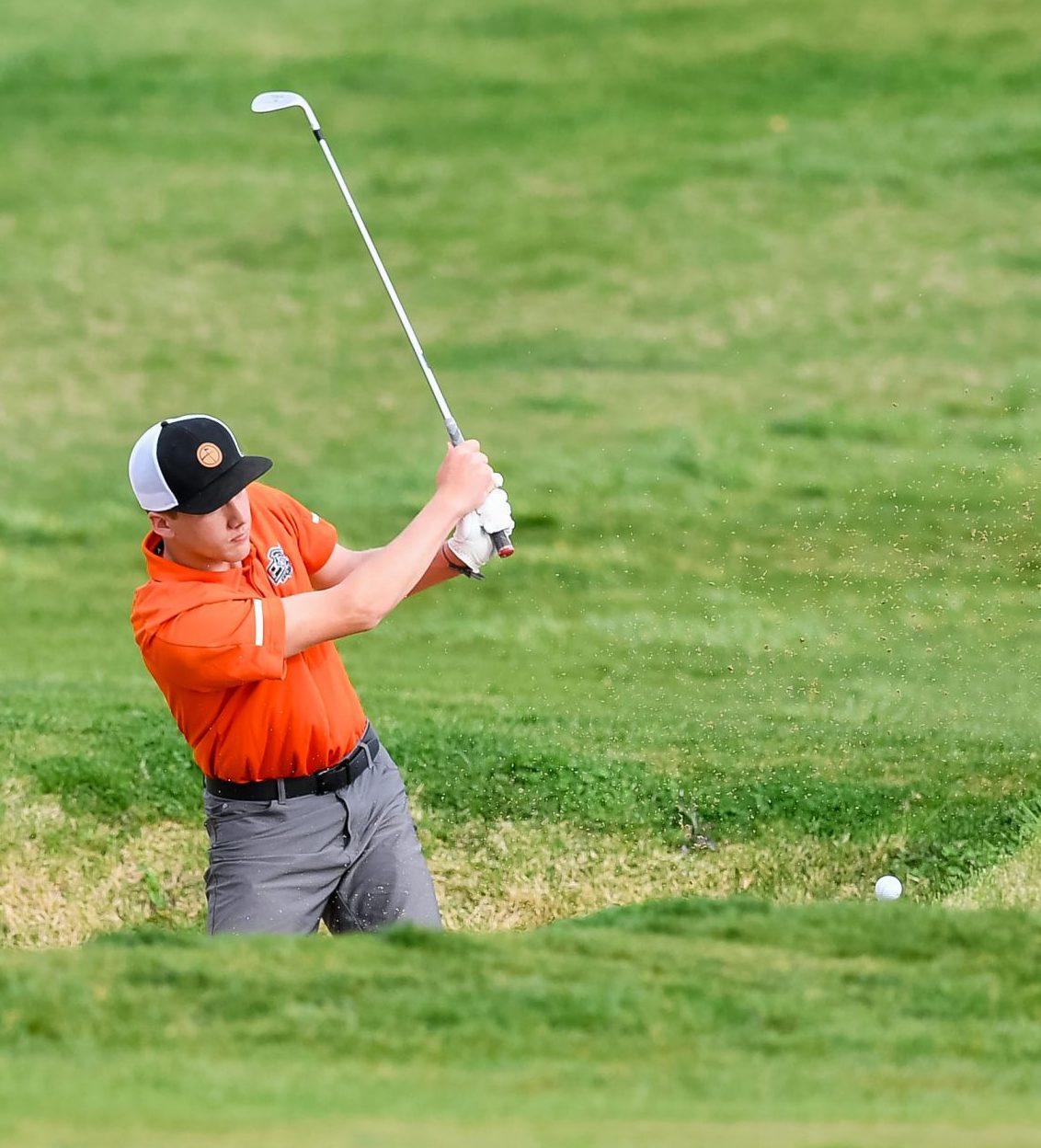 Platte County sophomore Parker Amos hits a bunker shot during the Highway 92 Showdown last week at Paradise Pointe Golf Complex in Smithville.