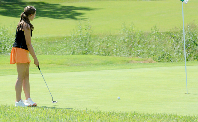 Platte County sophomore Erin Anderson watches a putt during the Liberty North Invitational on Monday at WinterStone Golf Course in Independence.