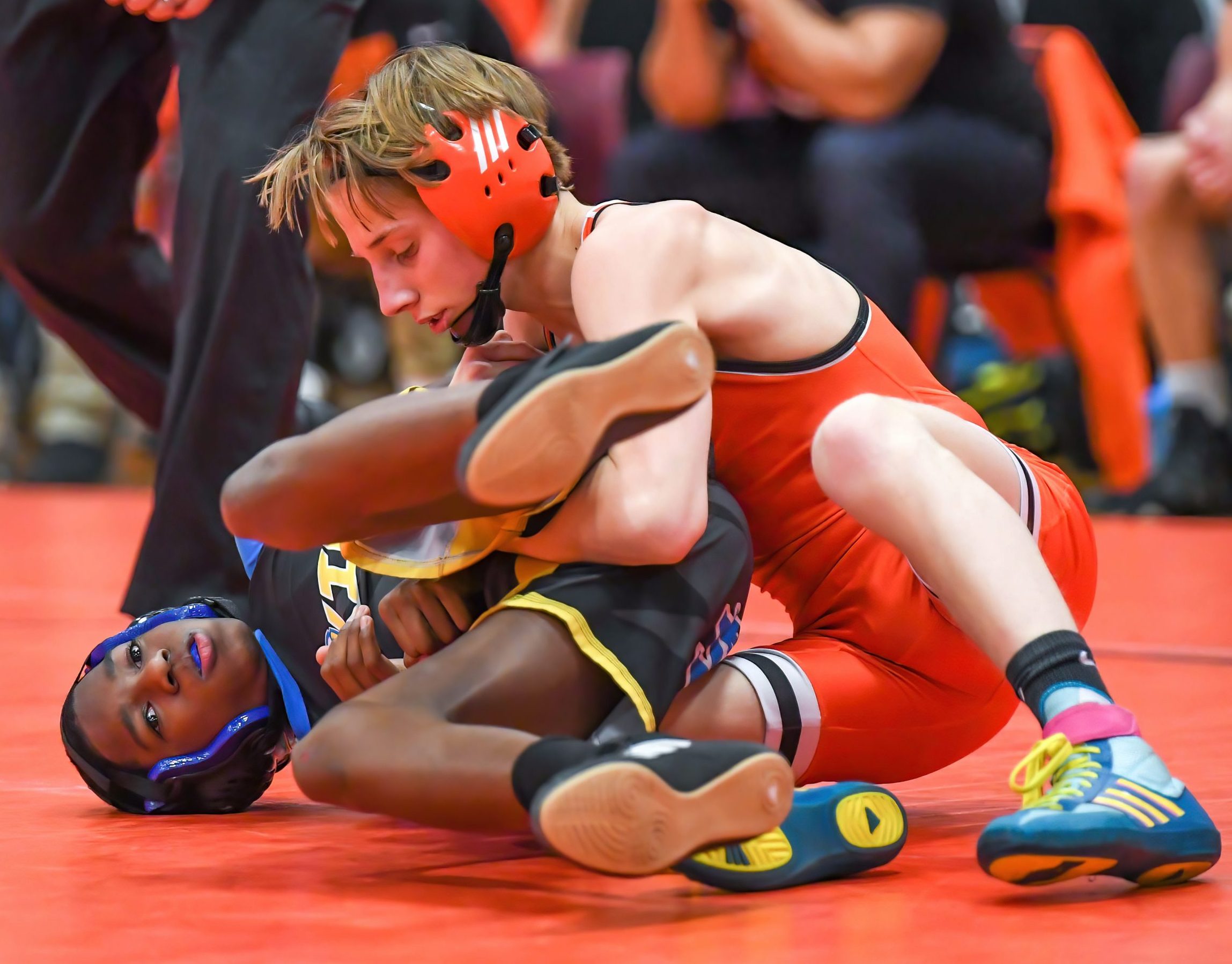 Platte County freshman Darrell Smith records a pin in a 145-pound match against Raytown South on Monday at Platte County High School.