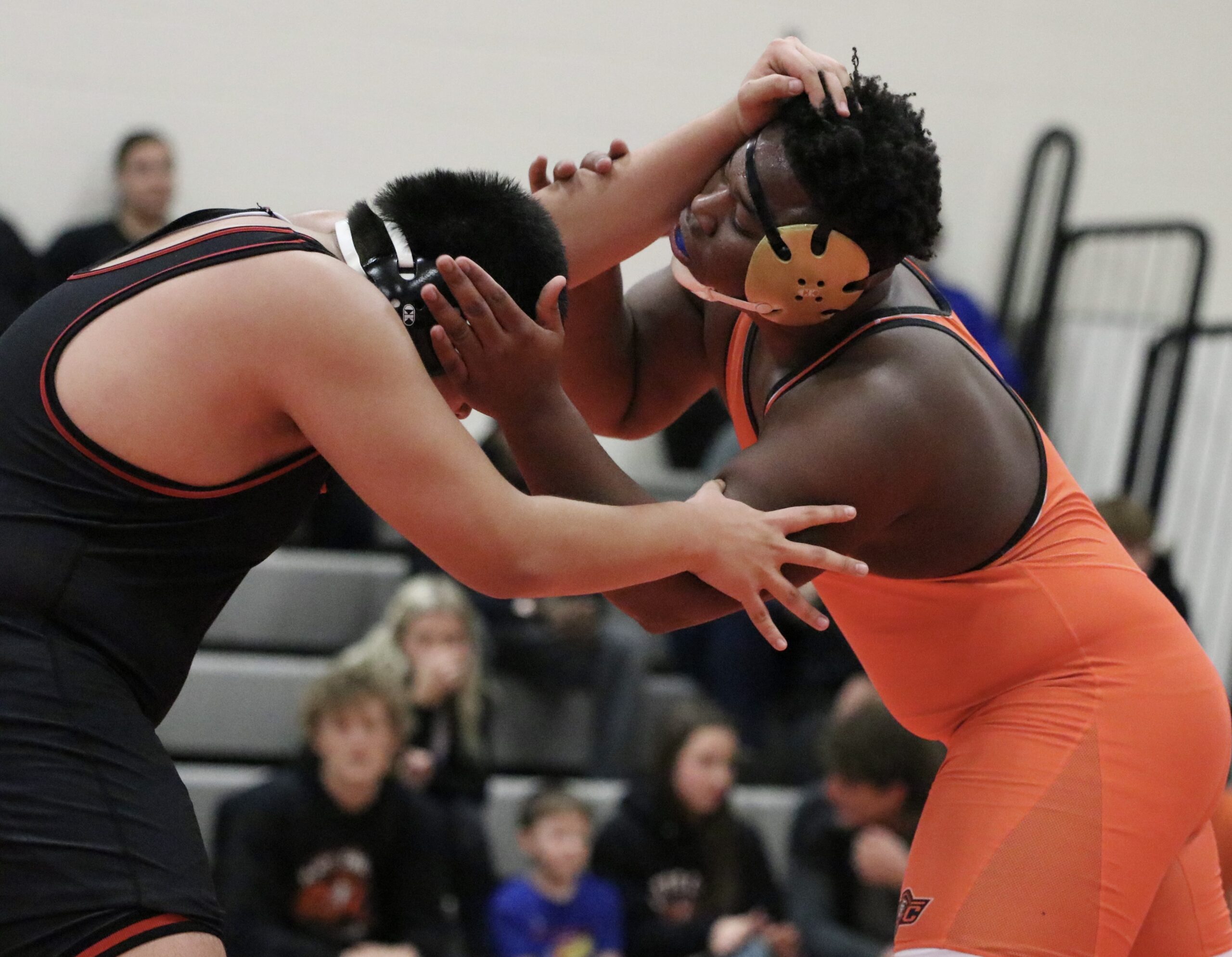 Platte County junior MarQues Brwon locks up with a Raytown South opponent in a 285-pound match Monday at Platte County High School.