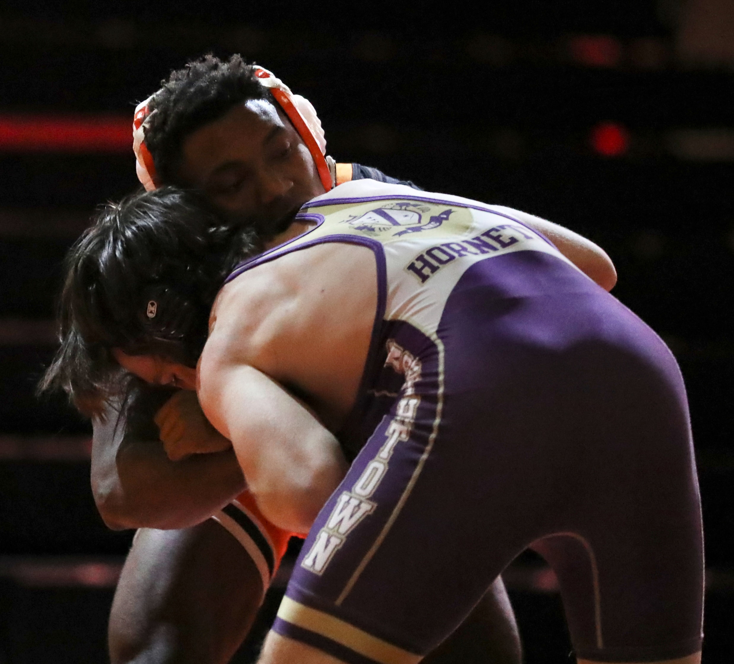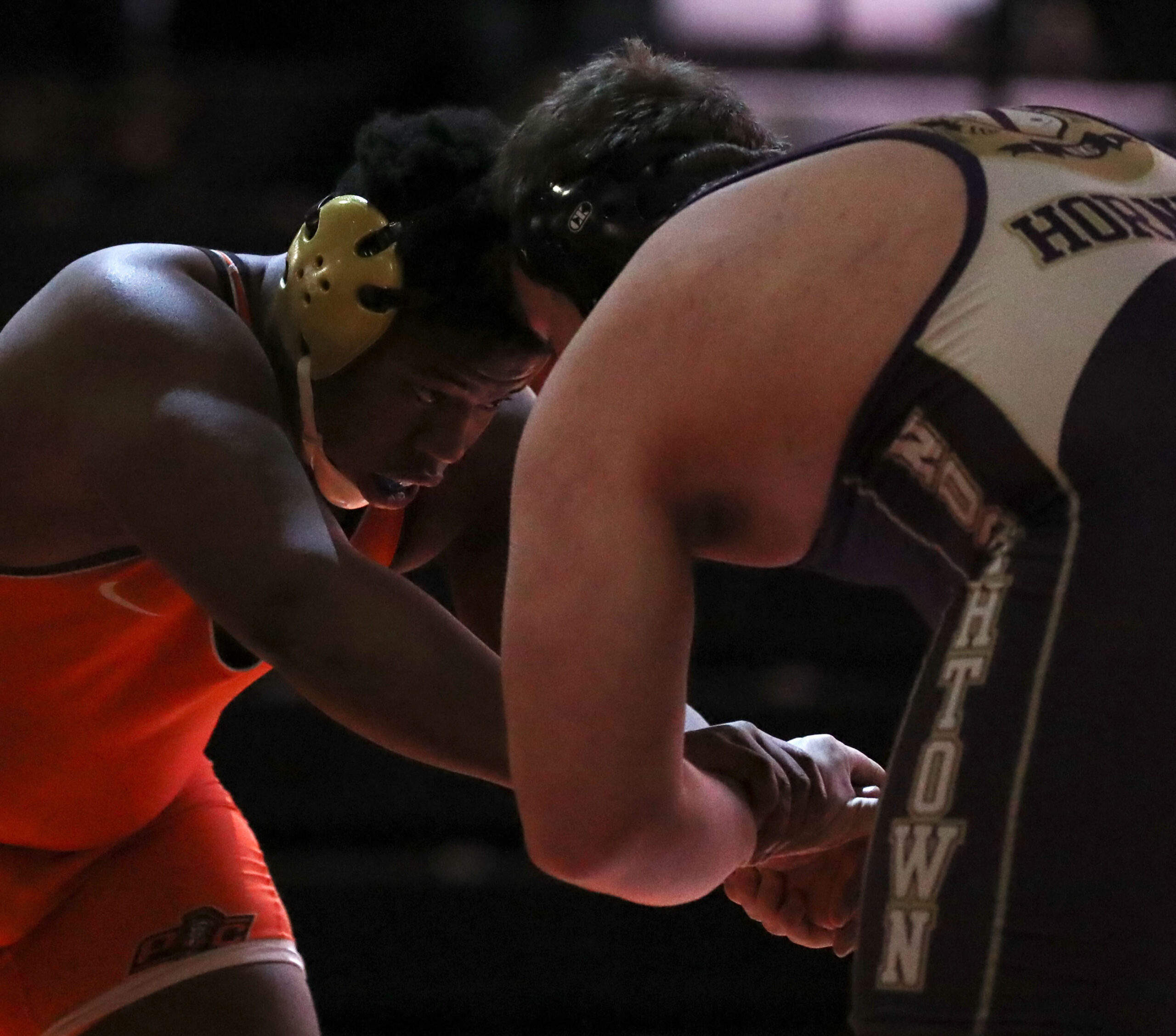 Platte County senior Mar’Ques Brown ties up with his opponent in the 285-pound match of a dual with North Kansas City on Wednesday at Pirate Fieldhouse.