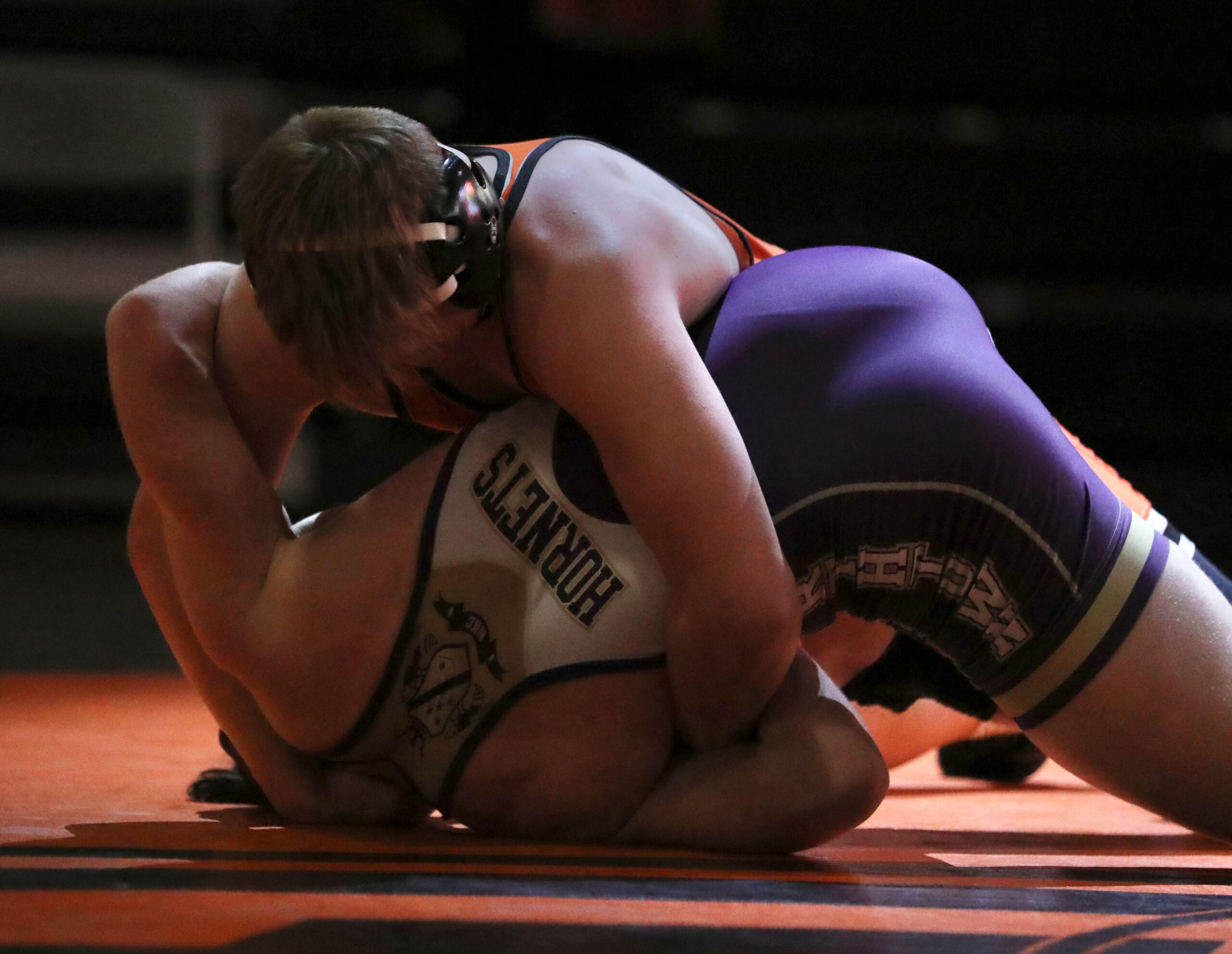 Platte County junior Caden Hulett locks up a cradle on his opponent during the 113-pound match of a dual with North Kansas City on Wednesday at Pirate Fieldhouse.
