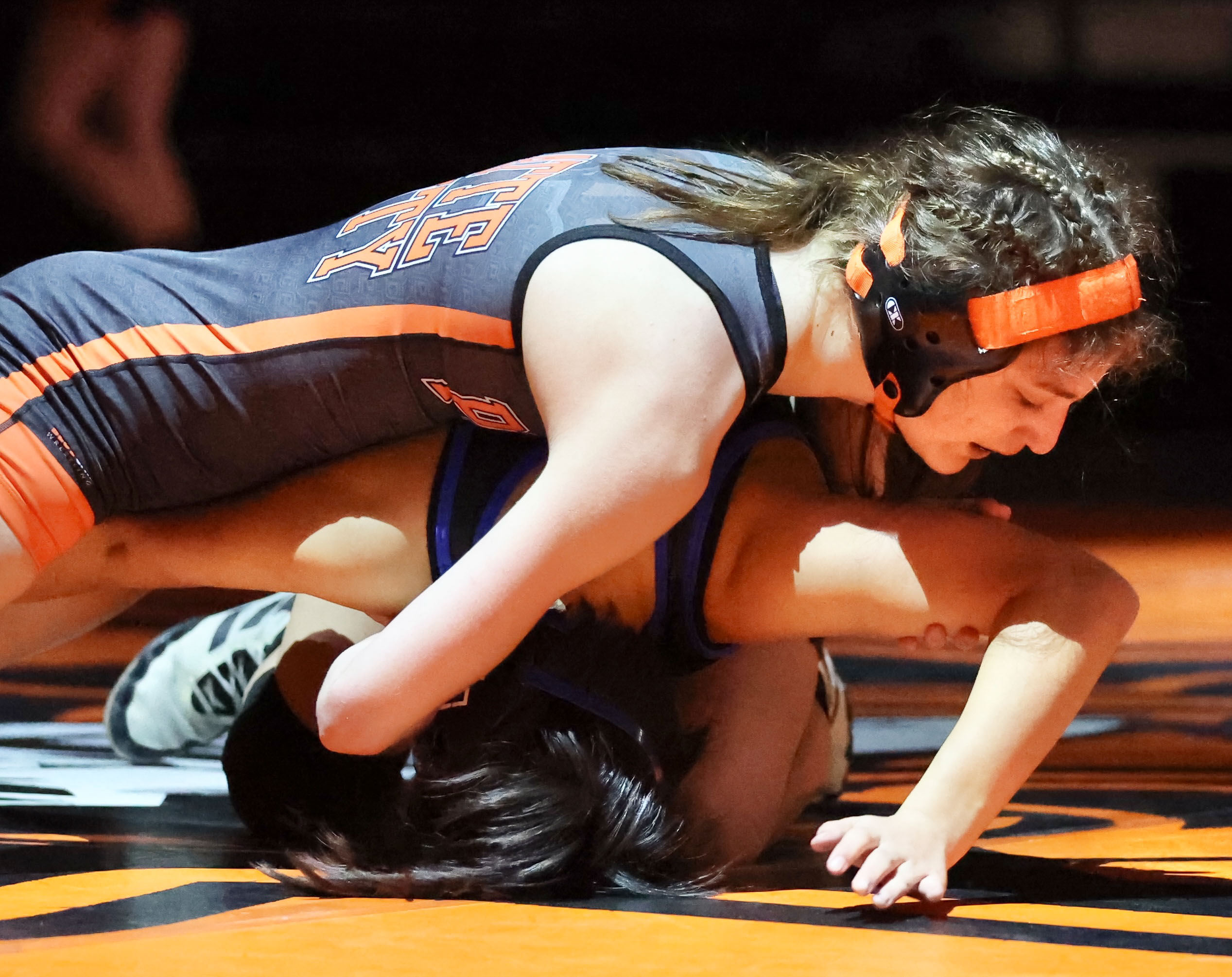 Currently battling Wiesehan for the 120 spot in the lineup, Gabriella Ciccarelli went from unseeded to the finals with pins in both her quarterfinal and semifinal matches. She scored the first takedown Olathe West’s Brooke Morgan but gave up the next 12 points and ended up pinned in the third period.