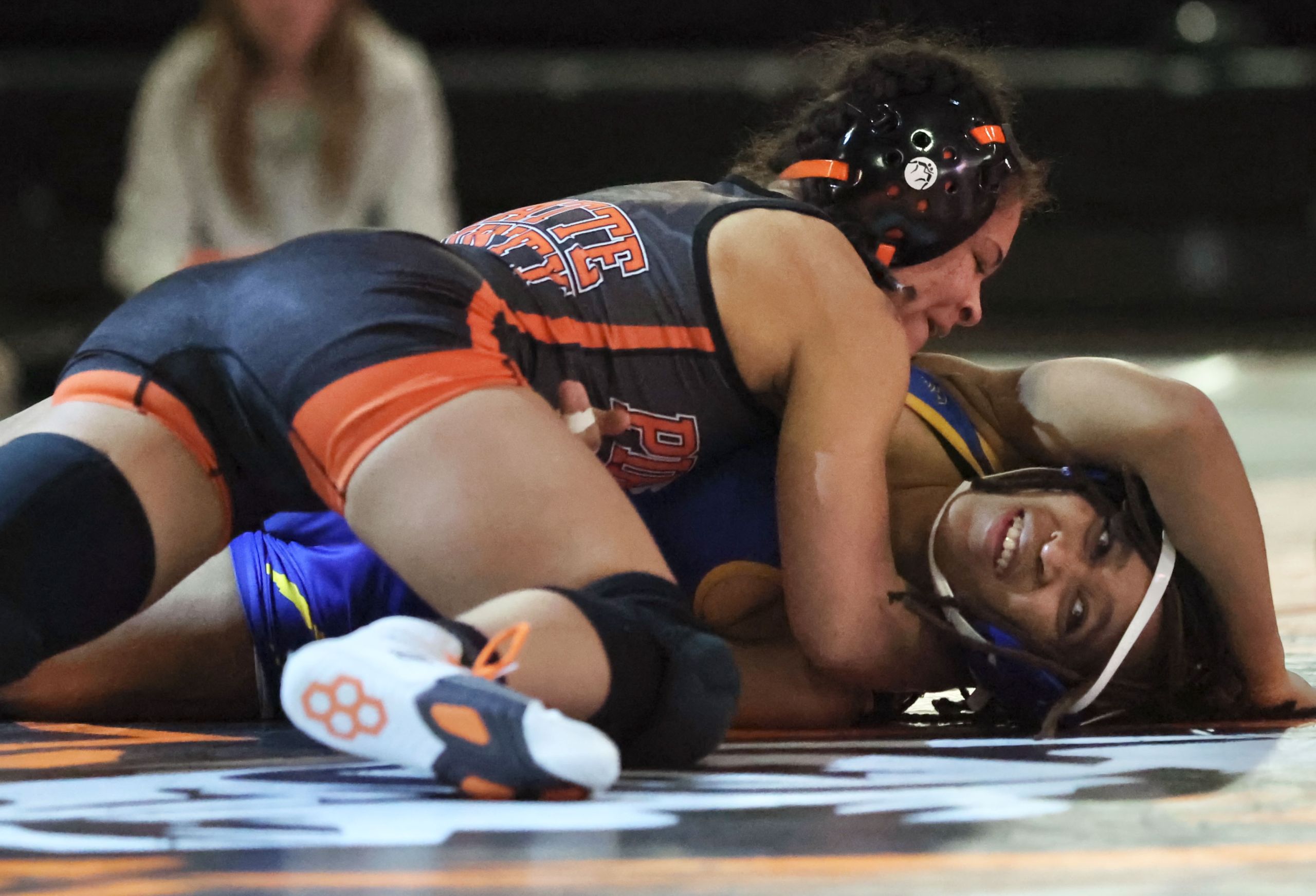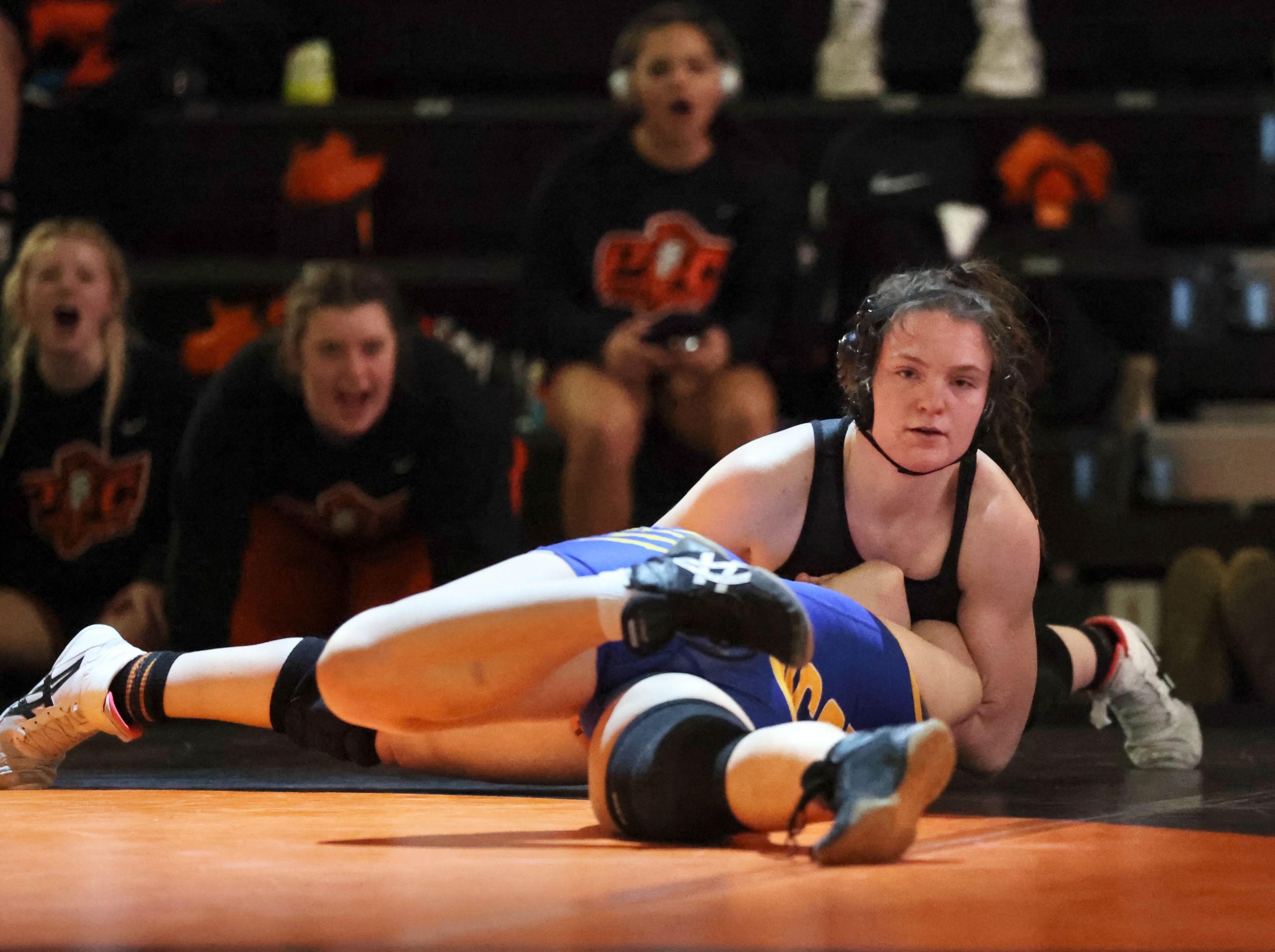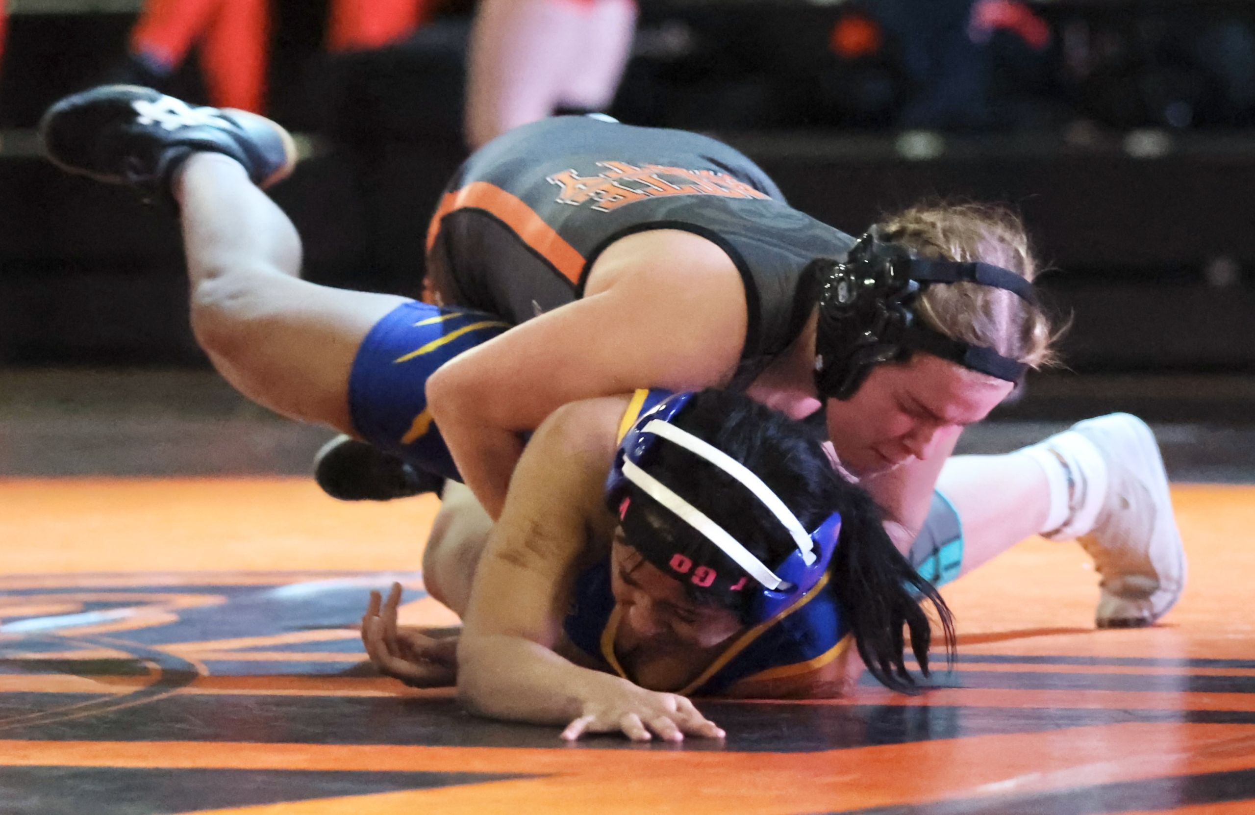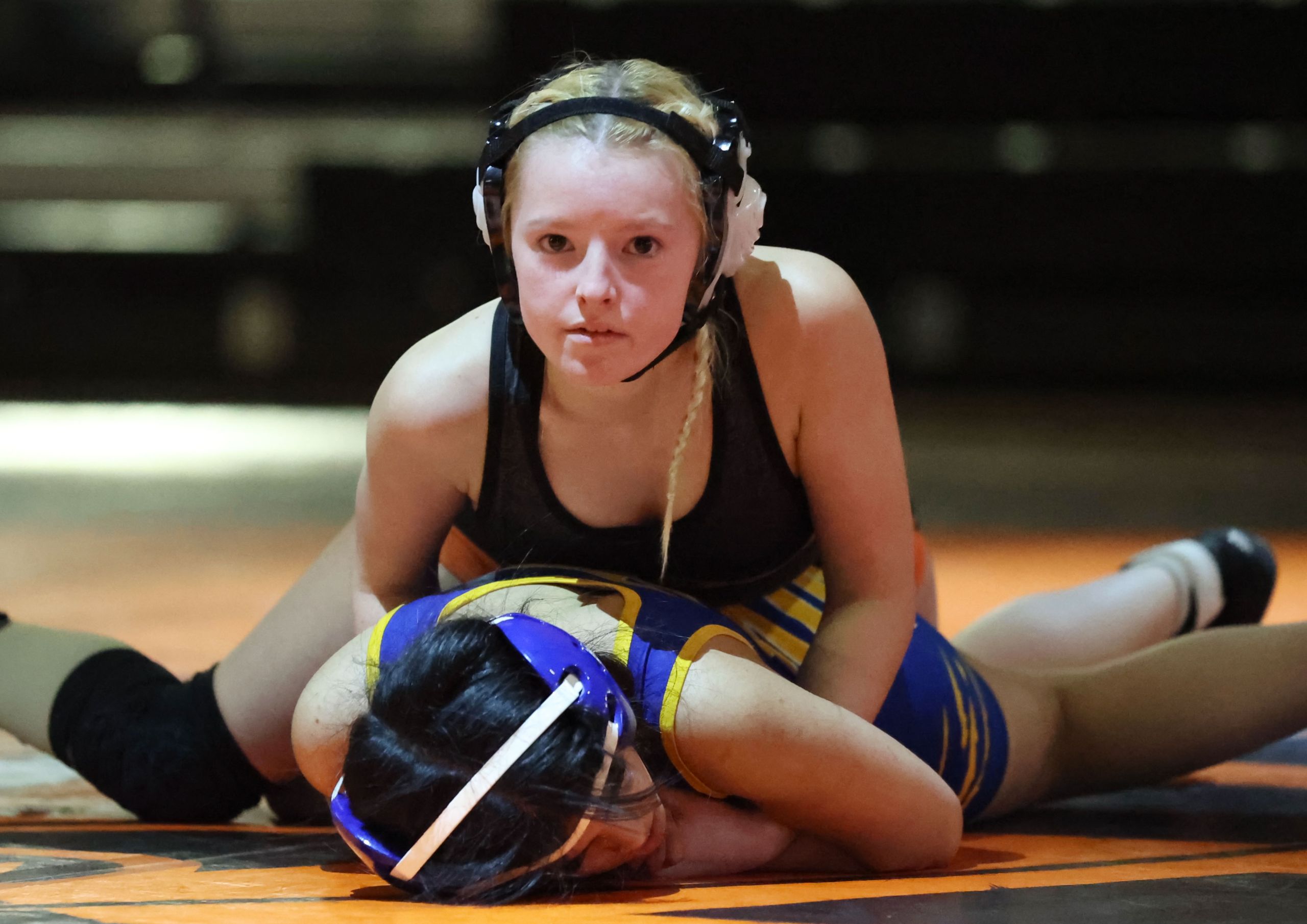 Stone, a former honorable mention all-state swimmer who switched winter sports as a junior, maintains a rapidly ascending profile as a potential two-time state qualifier with Class 2 medal hopes. She put Raytown’s Melanie Jimenez to her back with a powerful double-leg takedown and secured the fall in the 235 match after just 37 seconds.