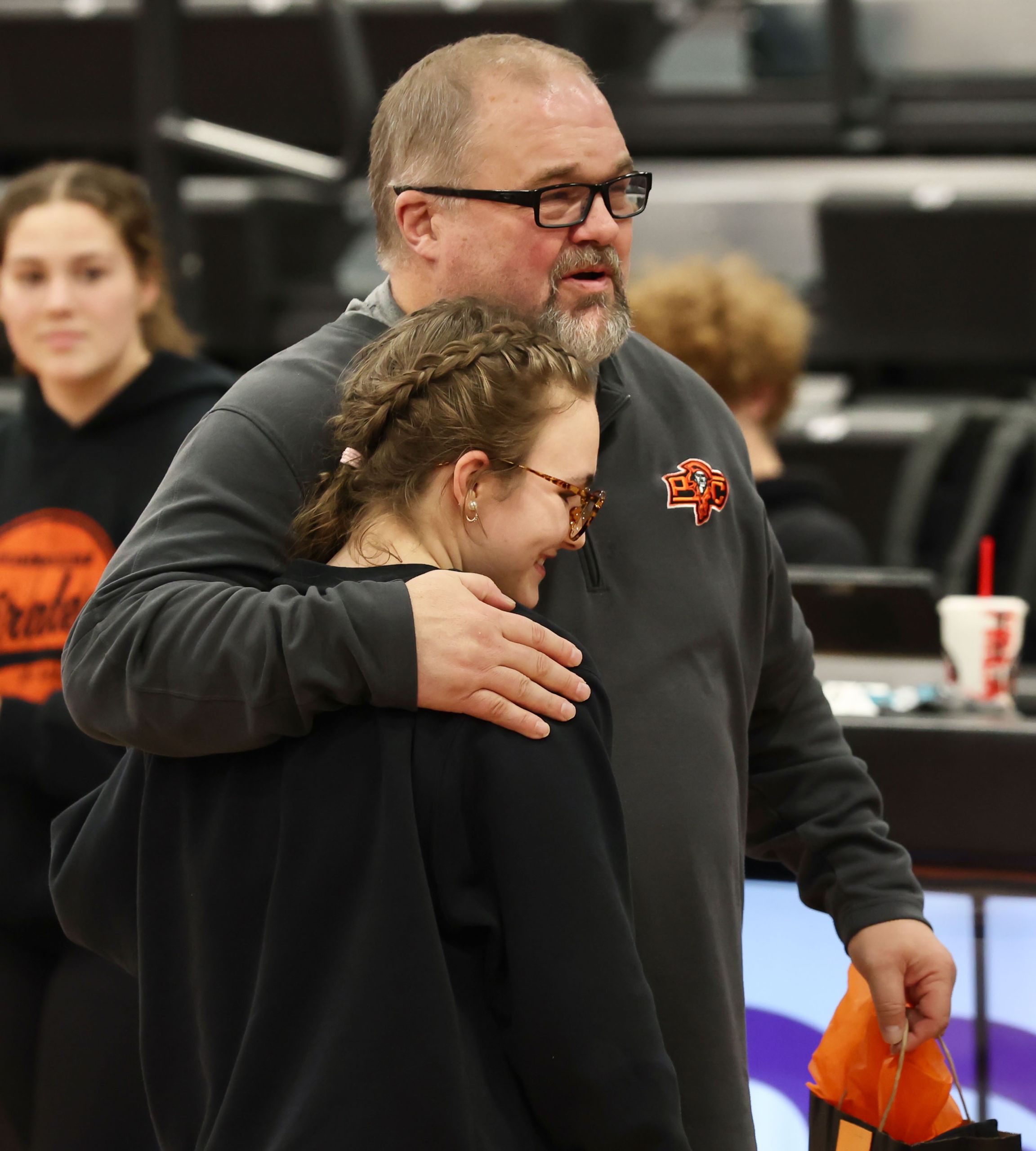 Platte County senior Taylore Lavery hugs head coach Reggie Burress during senior night ceremonies Wednesday at Pirate Fieldhouse.