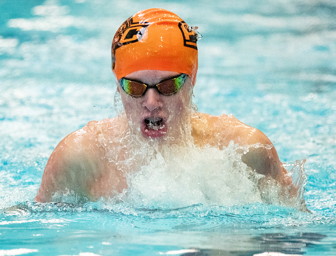 Platte County senior Weston Grimes swims in the 100-yard breaststroke during a triangular Tuesday at Platte County Community Center North.