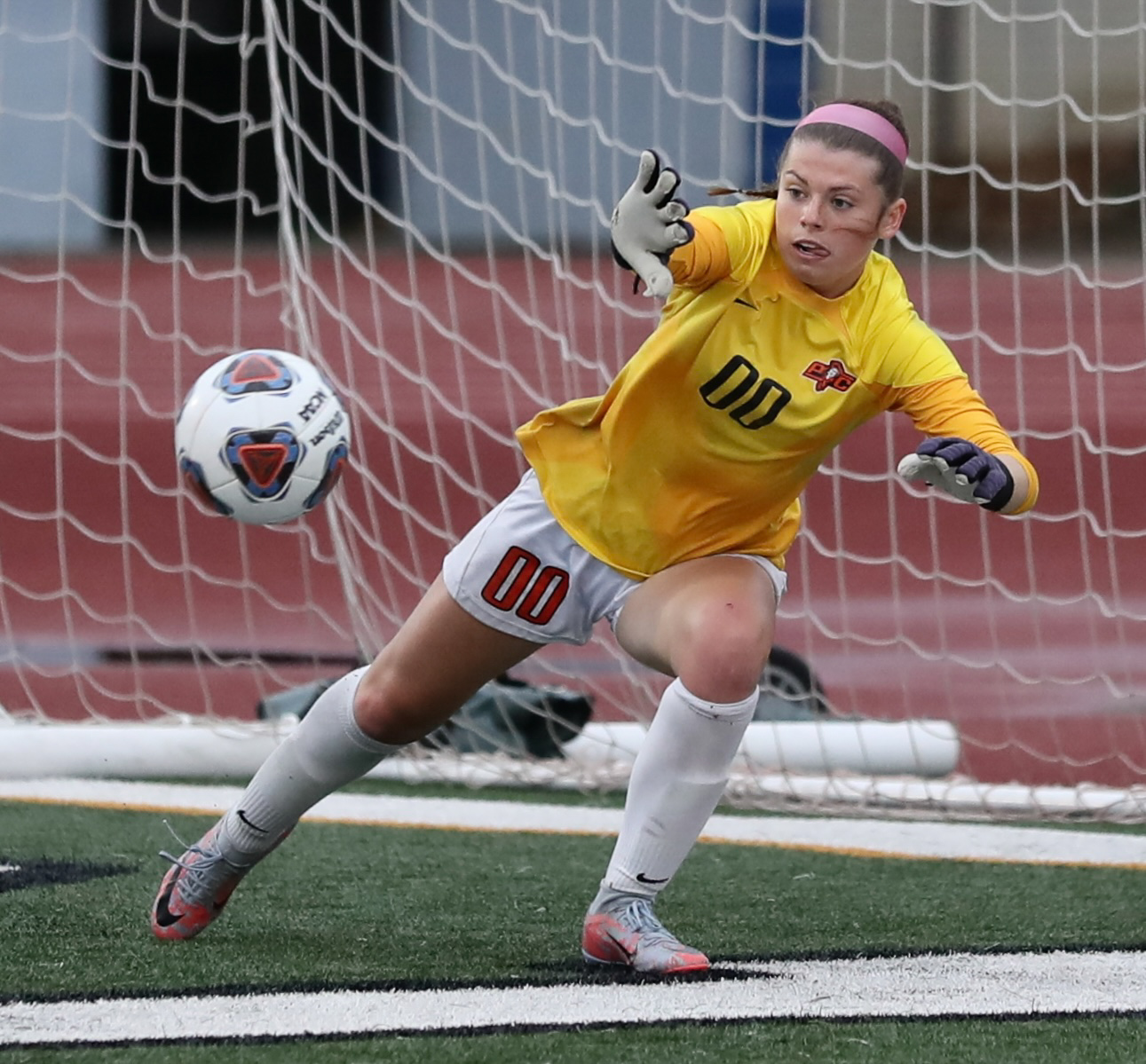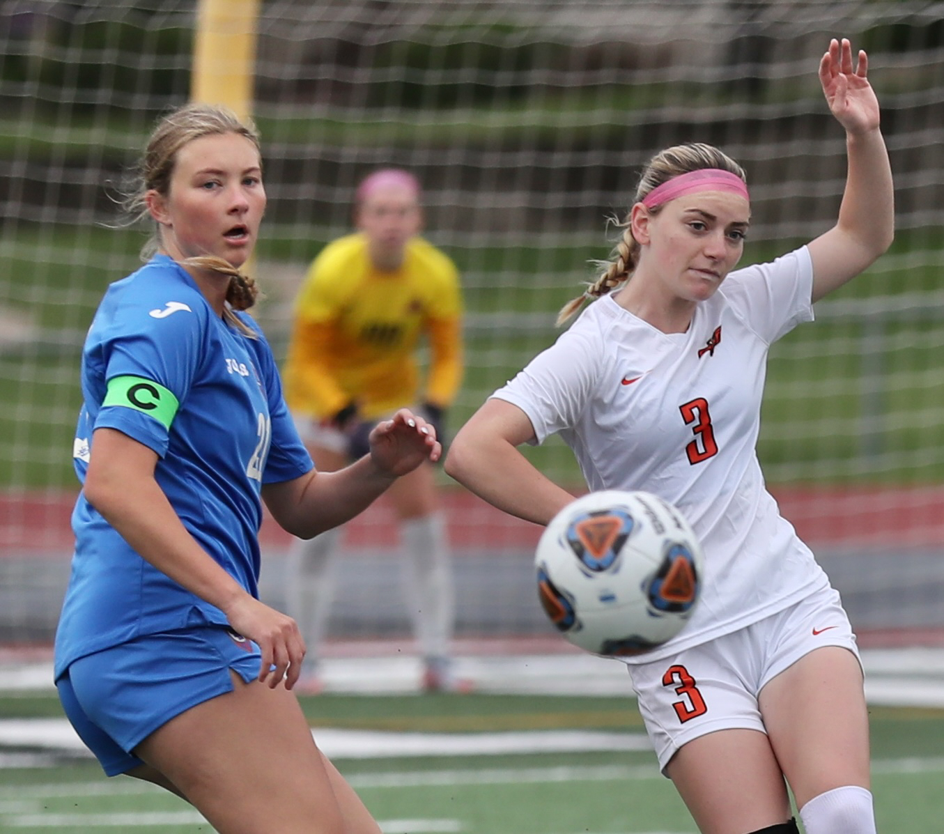 Kaser then came up big twice to keep Platte County’s deficit at just one goal. She survived a scrum in front of the Pirates’ net in the 38th minute off of another free kick from deep that was whipped into the middle and precariously lingered in a dangerous spot before being cleared away.