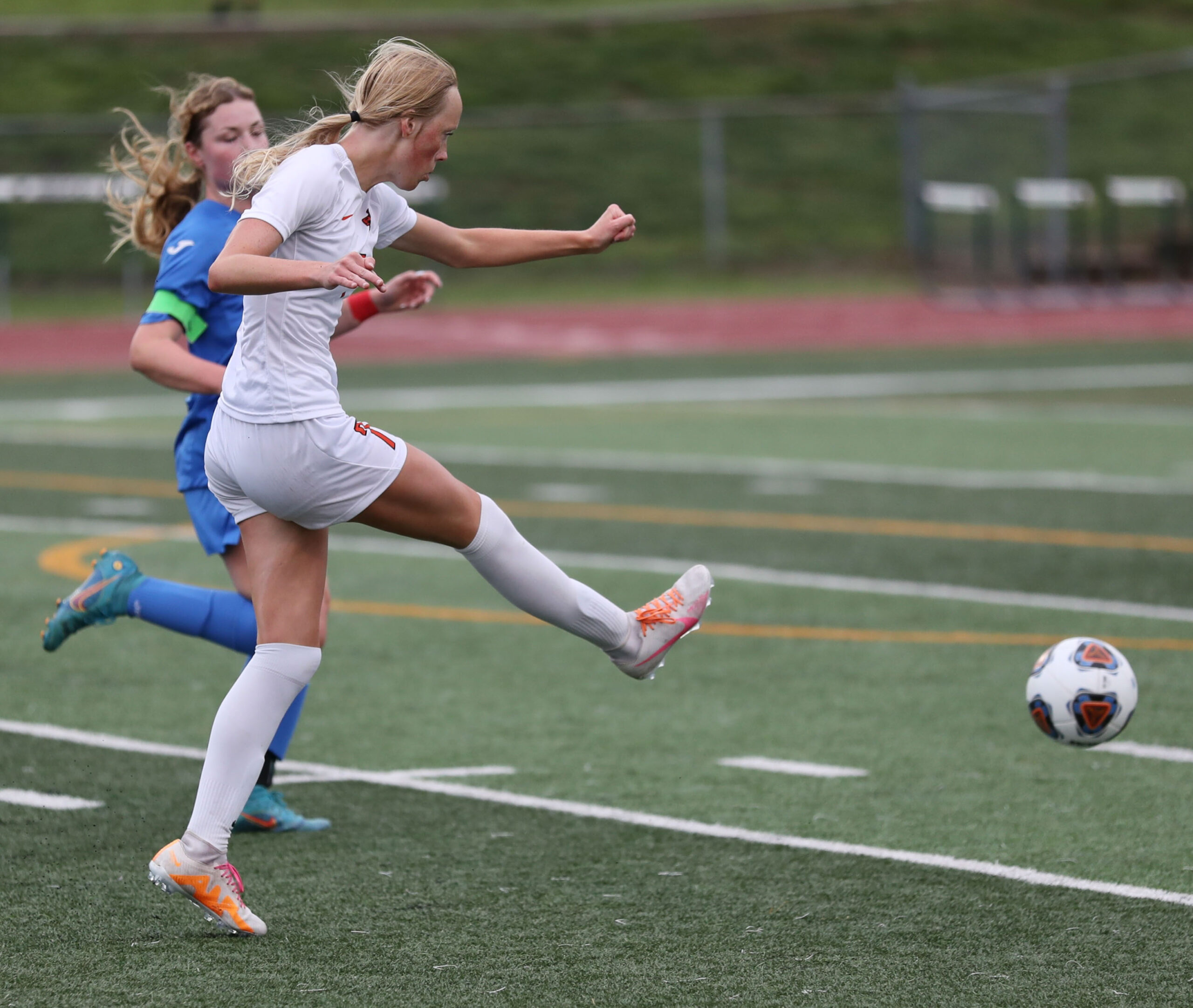 In the 64th minute, Kassen made a lightning quick move around the right edge of Pembroke Hill’s backline and cut inside but dragged her left-footed shot under press all the way across the face of goal and wide right. She also steered two headers toward goal in the closing minutes, the first without enough power to trouble the goalkeeper and the next missing the target.