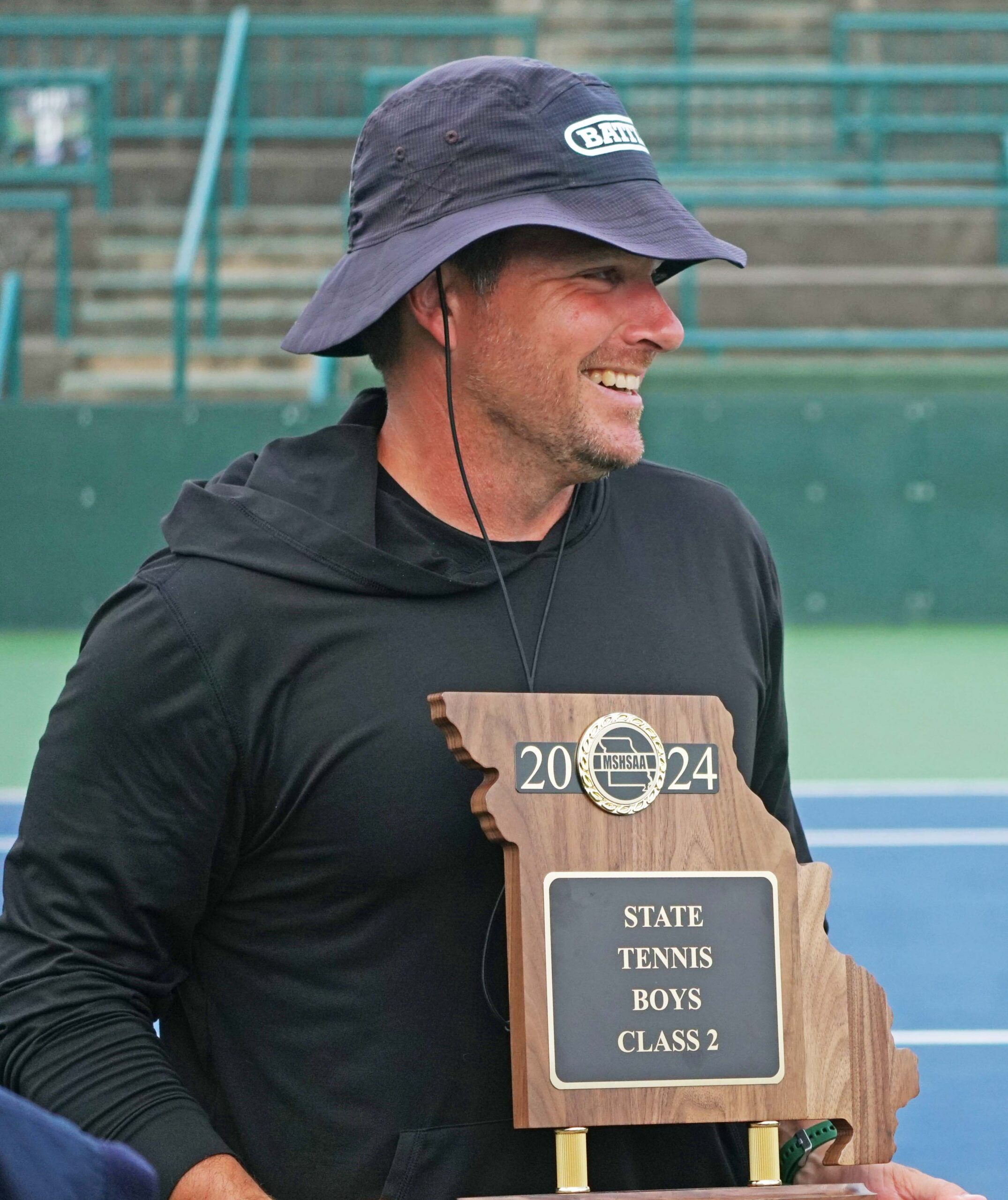 Platte County coach Zach Keith proudly holds the Class 2 second-place trophy Friday at Cooper Tennis Complex in Springfield.